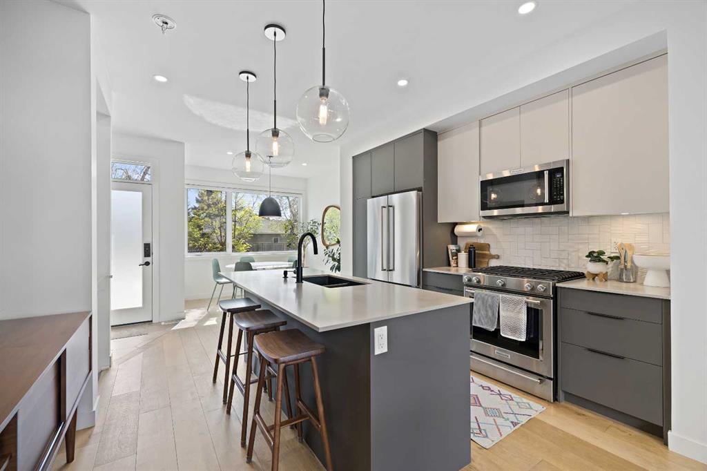 You’ll fall in love with this stunning 3-bedroom, 3.5-bathroom townhome in North Glenmore Park. This beautiful, immaculate home has over 1500 sq ft. of living space with 9-foot ceilings, engineered hardwood flooring, tons of light, and a kitchen with quartz countertops and high-end appliances. A bright dining area in the front, flows through the kitchen to a living room at the back of the home, anchored by a gas fireplace and opening onto the outdoor space. One of the many highlights of this home is the back deck area which expands your living space in all seasons – a favourite spot for the current owners. The main floor is completed by a half bathroom. Head upstairs to the primary bedroom featuring a walk-in closet, and sleek 4-piece en-suite. The 2nd bedroom is flooded with morning light and also has a walk-in closet. You’ll love having the laundry area upstairs – along with a second full bathroom. The lower level has been developed and features a recreation area ideal for a small gym, playroom, or just kicking back and binging your favourite show. This level also has a bedroom with walk-in closet, as well as another full bathroom. Close to parks, schools, Riverpark dog park, Sandy Beach, the Calgary bike path system, the Glemore Reservoir, Marda Loop – you’ll love being close to everything! You can be downtown in minutes, and you’ll also have easy access to Crowchild and Glenmore Trail. This unique townhome also comes with a titled single detached garage with added storage built in and Air Conditioning! Don’t miss the opportunity to make this stylish townhome yours!