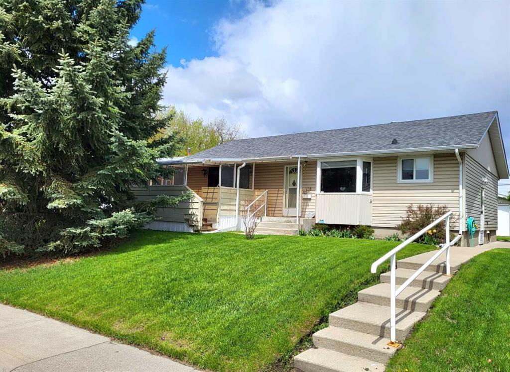 CHARMING BUNGALOW NESTLED IN A SERENE NEIGHBORHOOD. This 1051 sq ft bungalow offers a cozy yet spacious layout, featuring 3 bedrooms on the main floor plus 2 bedrooms in the basement. The main level is adorned with beautiful hardwood flooring, creating an inviting atmosphere throughout. Kitchen with stove/fridge/dishwasher plus pantry extending to dining area nestled near a sunny bay window. Living room with sliding doors to a covered south front yard deck. Well maintained through out the years with updates such as newer vinyl windows (dining not included), vinyl siding, metal eaves and soffits, asphalt shingles and concrete patio/sidewalks ensure both aesthetic appeal and functional against the elements. One notable feature is the side entrance leading to a basement with an illegal suite if wanted for extended family or friends, comprising of two additional bedrooms, a very spacious family area with gas fireplace for chilly evenings. Kitchen area with cabinets, stove/fridge and sink, 4-piece bathroom, laundry area with sump pump are conveniently located in the basement. Outside, an oversized carpenters or mechanics dream detached 24x26' garage offers ample space for vehicle storage and more. Equipped with gas heating, 220 wiring, solid workbench, and two garage openers. Moreover, there's room for RV parking alongside the garage, adding to the property's versatility and appeal. ALL THIS conveniently located in a quiet/mature location and walking distance to schools, down town shopping plus restaurants. Property to be sold as is.