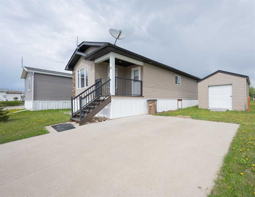 Welcome home to Aspen Village, located in Athabasca! This 2008 mobile is a great starter home in a quiet neighborhood. It features the most amazing floor plan with the living room, dining area and kitchen all open with a vaulted ceiling. The master bedroom has a walk in closet and 4 piece en-suite with a soaker tub. Main bathroom is a conventional 4 piece and the interior is completed with the second bedroom. There is also a separate laundry/utility room. It has a west facing balcony that you can enjoy the sunsets and a huge shed with a roll up door. 2 space concrete parking pad complete this great property.