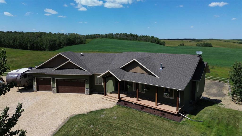 This Young Couple decided to Buy more Land creating an amazing opportunity for someone else to own their dream home! This is a must see CUSTOM BUILT HOME with an amazing setting and great views nestled in the rolling Hills just 5 minutes West of Bashaw along Pavement. Upstairs you have a Gorgeous kitchen with High End Appliances, and Solid Hickory Wood Cupboards, Oversized Island and Granite counter tops. Check out the tray ceiling in the Kitchen/Dining room, and you be wowed by the Large Walk in Pantry. Around the Corner you have a coffee nook that leads you to you tucked away Master Bedroom. All the Bedrooms are Large, and the Master features a 5 piece Ensuite with Tile Walk in Shower and Soaker Tub. Of course you have your walk in closet. Also on the main floor is a South Facing Living Room with Corner gas Fireplace with Rock face finish, 2 additional bedrooms, and an office with Built in Cabinets. Main Floor features a mud room area with main floor Laundry. Attached to the West side of the House is your 32'x32' heated garage. Off the North side of the House you have a Large Covered Deck with Duradeck flooring and glass hand rail. Front Deck is cedar decking. Now back in the house and downstairs is a Dream Basement for the sports lovers with a custom built golf simulator room (negotiable) that could also be turned into the perfect kids play room or work out area. To compliment the basement there is the Custom Built WET Bar. In the Corner of the Family Room is a Wood Burning Stove to set the ambience. Also in your Large Basement are two additional bedrooms, a bathroom and a storage room. The house has Canexel siding with smart trim, Windows are triple pane all weather windows with colored exterior to match the trim. Entire property has brand new rail and barbed fencing, equipped with a stock waterer and tons of grass for your horses or cows. There has been about 10 loads of gravel hauled into the yard. Owners recently brushed an area, stripped the top soil, and started to get a location ready to build a shop.