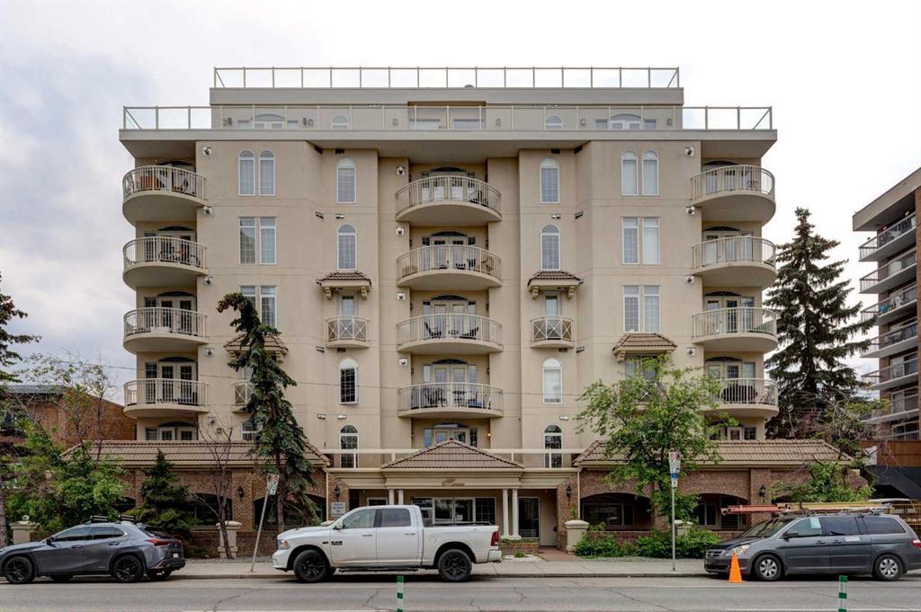 Welcome home to your urban oasis at The Monoco! Offering maintenance free living with a Roof top Patio, this sophisticated 1 bedroom plus Den condo contains over 690 sq ft of modern design. Features include a maple kitchen cupboards with undermount lighting, and a centre island plus a relaxing Gas fireplace with mantle in the living room, with stylish French doors providing access to your sunny East facing balcony. With 9ft ceilings, wide plank laminate floors, tile throughout and carpet in the bedroom, a ton of natural light accentuates your living spaces, including the primary suite with large dual arched windows. Completing this unit is an Office and ensuite laundry, as well as 1 Titled, Heated Underground Parking Stall and a Bike Storage room. This chic condo is close to trendy 17th Avenue, with nightlife, dining, pubs, and many other unique shopping experiences. Purchase this sophisticated condo in a well-maintained building, which offers unsurpassable Inner City Living.
