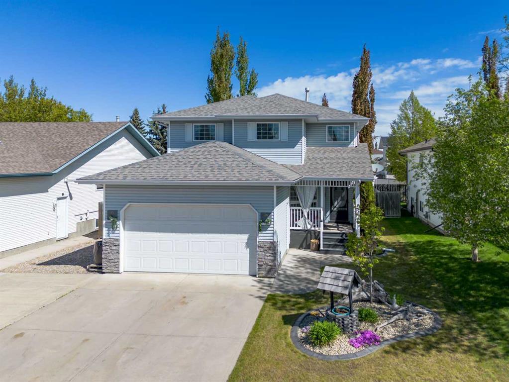 This stunning family home is a true gem with upgrades galore! With 5 bedrooms and 4 baths, this immaculately kept home features a beautifully upgraded kitchen with custom counters, island, and stainless steel appliances. Enjoy the convenience of remote-controlled blinds in two rooms, a den-office, main floor laundry, and an elegant formal dining area that opens up to a beautiful living room with a gas fireplace and soaring 20' ceilings. The master bedroom is a luxurious retreat with a tiled steam shower, vanity, heated tiled floors, and a spacious walk-in closet. Upstairs, you'll find two more good-sized bedrooms and a full 4 pc bath. The basement offers a cozy rec room with a brick feature wall, two additional bedrooms, and a large bathroom with a tiled walk-in shower. A cold room and storage area provide ample space for all your needs. Step outside to the serene oasis of the backyard, complete with cherry and plum trees, perennial flower beds, and a deck for outdoor enjoyment. This home also features a welcoming front veranda and central A/C for ultimate comfort.