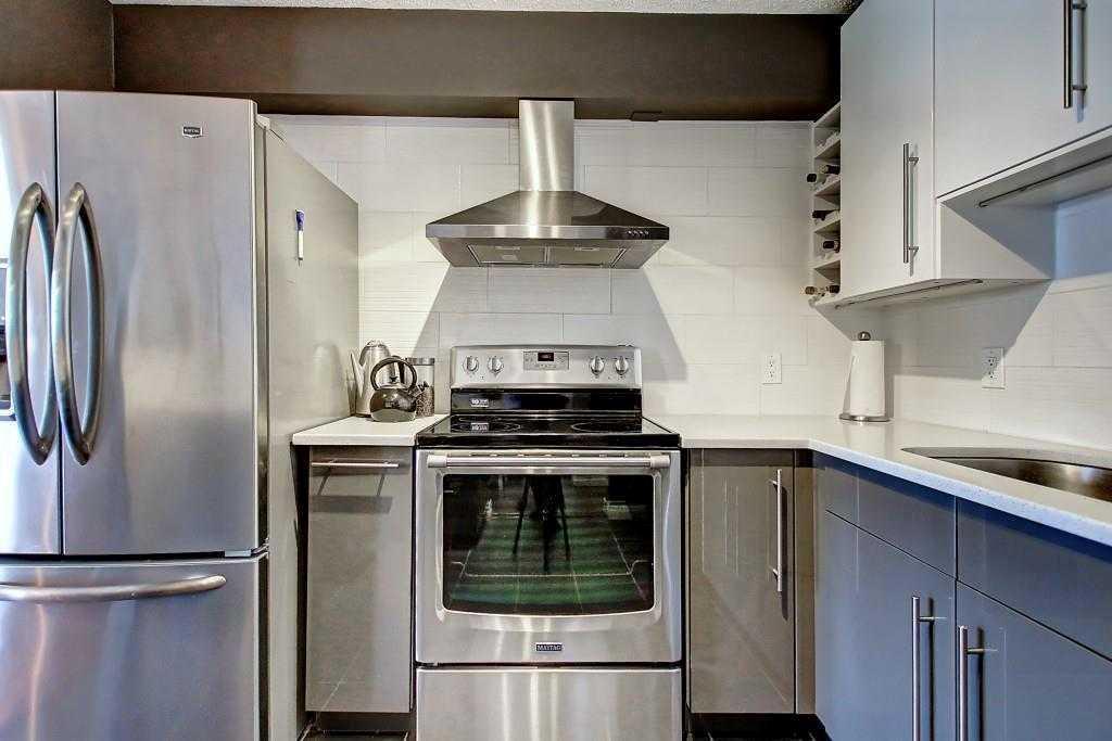 This home has recently been professionally renovated with beautiful high-gloss kitchen cabinets, a chimney hood-fan, Italian backsplash and quartz countertops with a raised bar. The kitchen includes a large pantry which houses a European Washer/Dryer: this is the perfect location in the kitchen as you're a step away from the sink to pre-soak the laundry. A formal dining space has amazing views towards Calgary's skyline and the balcony offers both indoor and outdoor spaces to unwind while taking in the exceptional view. The main living space is open concept with laminate flooring throughout creating a cozy ambiance for relaxation and social gatherings. An adjacent office/den area offers versatility and convenience. The primary bedroom is large and can easily accommodate a king size bed, it includes ample closet space; the 2nd bedroom is generously sized offering both comfort and storage options. The bathroom is a haven of luxury, showcasing quartz countertops, new tile and a premium GROHE fixtures so everyday feels like a spa day. There is heated underground parking, a meeting room and a south courtyard patio adjacent to a common laundry room. This is a prime location steps from the C-Train, MNP Sports Centre, 17th Ave and 1st Street District for restaurants & shops. Pet policy: Pet not to exceed 50 kg unless approved by the condo board.