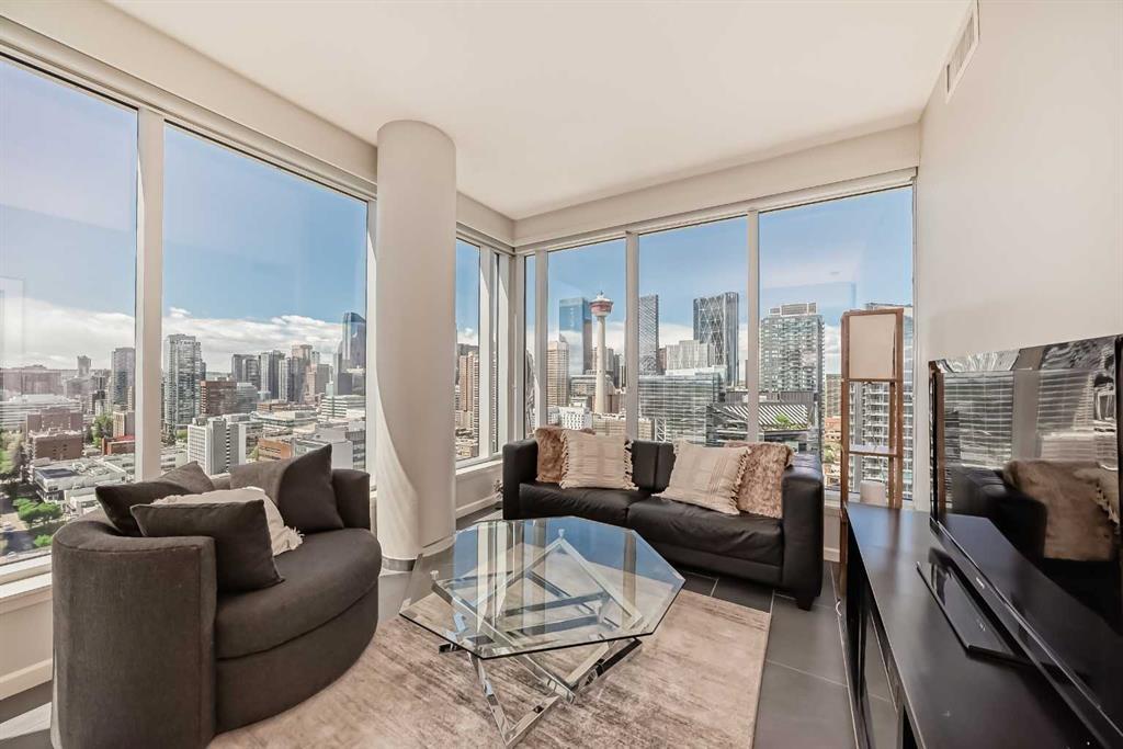 Hands down, this view is the best location in the building! Incredible mountain views and Calgary Tower too. In this corner unit, you can just relax, look out the wrap around windows and soak it all in! The night sky is phenominal too. (If you want to see that, please ask for a night showing - the Calgary Tower and all buildings are lit up and it is breathtaking in person) This modern two bedroom unit is perfect for those with impecible tastes and features a spacious primary bedroom with walk in closet and full ensuite. A second bedroom with mountain views is also fantastic. In-suite laundry, second full bathroom and living room round out this space. For those who work from home, extra wiring has been completed from Telus to allow for maximum high speed internet. The sleek black granite kitchen adds elegance and luxury to any meal. At the end of the day, grab a cold one and watch the sun set on the west facing balcony. This building also has ample storage and a fully equipped gym on the second floor that is a must see. One titled underground parking stall is included with this unit and the building is tightly monitored to ensure safety and even has a lobby concierge. Close to everything downtown and steps to Stampede Park, this building and unit on the 21st floor truly is one to check out!