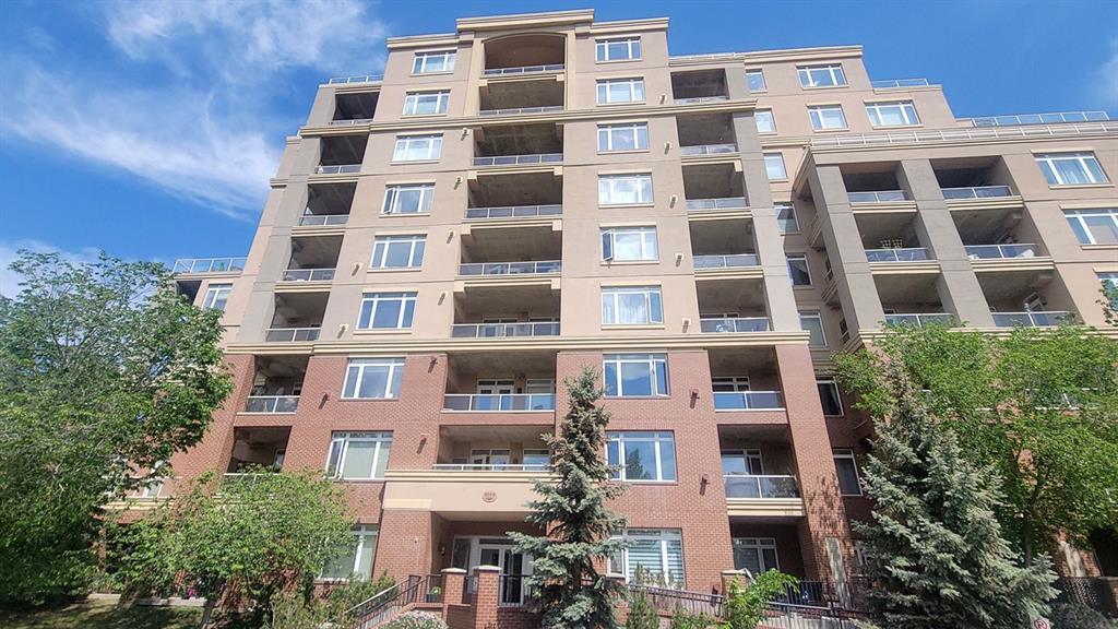 Wonderfully located one bed, one bath + den condo in a concrete building steps from Shaganappi Golf Course. This unit has 9’ tall ceilings and an open floor plan with some laminate flooring, tiling and carpet. The kitchen is neutral and well laid out featuring STAINLESS STEEL APPLIANCES. In-suite laundry adds to your comfort and convenience. The bathroom has a separate soaker tub and shower. Enjoy the views from the covered balcony. The building’s amenities include a well-equipped fitness centre, a party room with a fireplace, guest suites, a workshop, carwash. Close to shopping, C-Train Station and walking paths. This unit is air conditioned(only floors 6-9 in the high rise has this) and comes with two titled parking stalls and a storage locker in a secure heated garage.