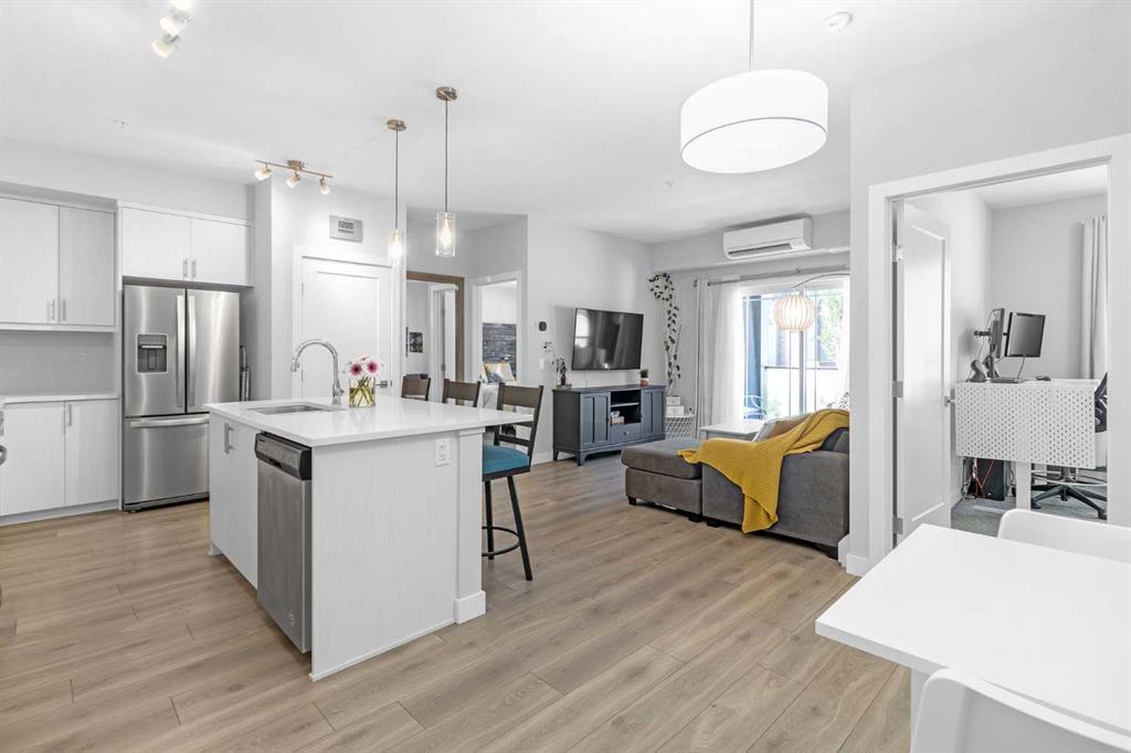 Nestled in one of Calgary's most desirable neighbourhoods, this spacious and thoughtfully designed interior features an open-concept layout that seamlessly connects the living, dining, and kitchen areas, creating an inviting space for relaxation and entertainment. Large windows and Patio door drench the condo with natural light, highlighting the modern finishes throughout. The kitchen boasts ample cabinetry, quartz countertops, stainless steel appliances, and a large pantry. The master bedroom features a walk through, and a 4-piece ensuite with a walk-in shower and dual vanities. The second bedroom is perfect for guests, a home office, or a cozy retreat, with a conveniently located 4-piece main bath.
