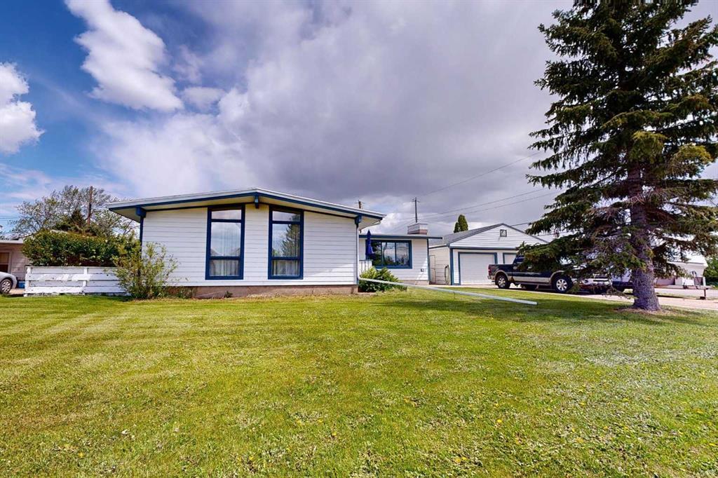 This home has the ideal design for families that need plenty of versatile living spaces. The property is huge, consisting of a double lot and is just across the street from the ag grounds, with the curling rink and community hall just down the road. Located just 1 block from the schools and playgrounds, this is a pretty great spot for families with school age children. The main entrance of this home is spacious with an easy to clean tile floor. The living room and dining room have vaulted ceilings, expansive windows, and plush carpet. Around the corner, the kitchen has stainless steel appliances and an island with seating. Down the hall, there are a couple closets, 2 bedrooms, and a clean, 4 pc main bathroom. The primary bedroom is a huge space with 3 closets, and a 3 pc walk through ensuite which is also accessed from the family room. Here, there is a wood burning fireplace, a door to the back deck, and also another bedroom. Heading downstairs, there is a door to the side yard. This bright basement has plenty of design options, with an open area ideal for a second family room, home gym, kids play area, etc. There is another large bedroom, a den, and a lovely, 3 pc washroom. Outside, the attractive front yard has a small deck to the main entrance and the two-car garage with parking pad/driveway is on the south side of the house. The backyard is great for families with younger children as it is fully fenced and there is plenty of grass to enjoy. There is a partially covered back deck, a patio, and also a couple garden sheds. The side yard also has a patio for the barbecue or smoker and a boardwalk leading to the back gate. Your family is sure to enjoy this lovely home.
