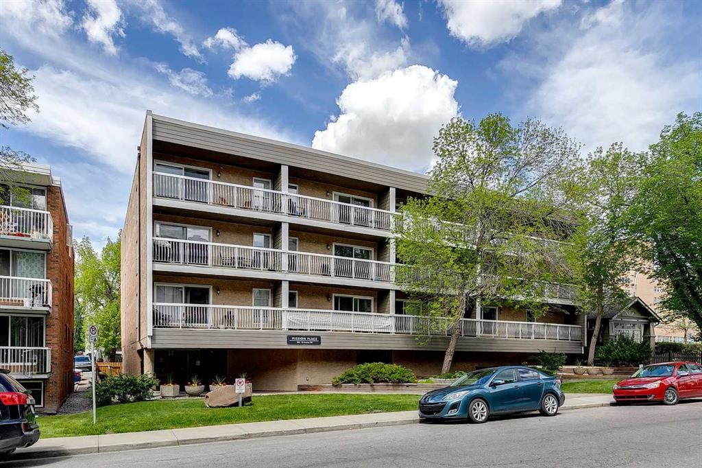 TOP FLOOR SOUTH FACING UNIT. FRESHLY PAINTED and ready to move in! Steps away from vibrant 4th street amenities and the elbow river pathways, this building was one of few in sought after Mission not to have been affected by the 2013 flood. This complex is well managed and beautifully maintained by LIVE-IN CARETAKERS. This bright and open 1 bed, 1 bath unit has a huge kitchen with plenty of counter space and STAINLESS-STEEL APPLIANCES (2017), DISHWASHER (2023). The large living room is lined with wall-to-wall windows leading to a balcony spanning the width of the entire condo and overlooking a beautiful street lined with mature trees. The primary bedroom is large enough for a king bed and dressers. The bath features a deep soaker tub and shower, as well as a brand-new low flow toilet. In suite laundry and storage room completes this fabulous unit. The complex is well managed by an active board and is beautifully maintained by LIVE-IN CARETAKERS. Enjoy the COVERED PARKING with electrical for cold days, ADDITIONAL STORAGE with WORK BENCH, SEPARATE BIKE STORAGE, ELEVATOR, and beautifully kept grounds. ROOF (2023), HARDY BOARD EXTERIOR (2018), ELEVATOR update (2018), Upgrades to covered parking structure (2024). Come and view today!