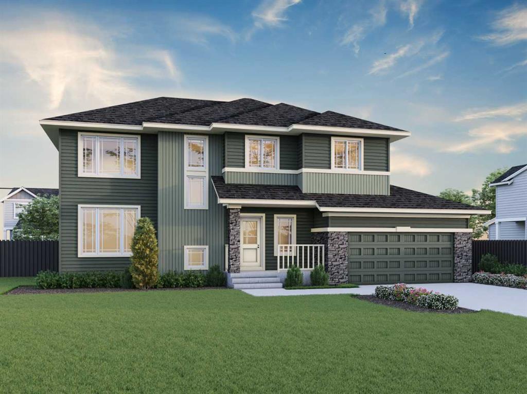 Discover Patrick by Sterling Homes Calgary. This spacious 2311 sqft home offers numerous features for comfort and convenience. Designed for families, this 5-bed, 3-full bath residence suits wide, shallow lots, providing a serene countryside experience. The home features 9' knockdown main floor and basement ceilings, creating a sense of grandeur. The executive kitchen includes built-in stainless steel appliances, a walk-in pantry, chimney hood fan, waterline to the fridge, and gas line to the range. Enjoy a full bed and bath on the main floor, black hardware throughout, and quartz countertops with undermount sinks. Luxury Vinyl Plank (LVP) flooring extends throughout the main floor and wet areas. The living area has an electric fireplace with a floor-to-ceiling tile face and MDF mantle. The 5-piece ensuite includes a soaker tub, dual sinks, walk-in shower, and barn-style sliding door. The home also includes a 21'×22' double car garage on a 69' wide lot. .*Photos are representative*
