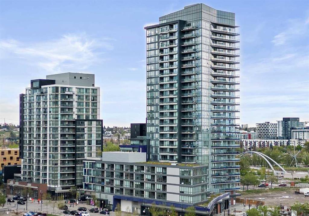 Welcome to the Verve in Downtown East Village, where downtown living meets convenience. This 1 bedroom 1 bathroom unit has been kept in pristine condition over the years and offers a sleek and modern style with an abundance of natural light. The entrance of the unit offers a good sized storage closet as well as a den, perfect for a home office or additional storage space. The bright and open kitchen features built in appliances, designer tile backsplash, as well as a built-in dining table. Enjoy unobstructed views of the Bow River from the large floor to ceiling windows in the living area. Just off of the living room are sliding doors out to the large balcony where you can enjoy the scenery. The large primary bedroom comes equipped with a good sized closet and is filled with light coming in from the floor to ceiling windows. The unit is complete with a 4 piece main bathroom and in suite laundry. This unit offers 1 titled underground parking stall as well as a large assigned storage locker. The complex features many amenities including a party room, fitness centre, 24 hour security, rooftop terrace, and more. Located steps from a park and within walking distance to multiple amenities, restaurants, transportation, and more. Perfect for the young professional or investor. Exceptional value!