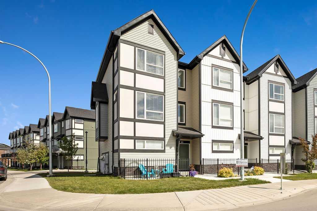 Welcome home! You've been looking for a place to call your own, and this end-unit townhome is it - with spacious open concept living, 3 bedrooms, 2.5 bathrooms, and double garage across from a green space. Your new home is naturally bright thanks to windows on three sides including SW facing and SE facing over the green space without obstruction from neighboring homes. The main living floor features generously size living room, dining room and kitchen in an open layout, as well as a nook with built-in desk and a powder room. Light and cool colors give the entire home a relaxing vibe. The layout is perfect for spending time with family or entertaining - the kitchen has loads of functional counterspace including 2 eating bars! You'll love the private covered balcony with gas BBQ hookup off the kitchen for grillin' and chillin'. If sunny patios are your thing, then you'll also love the ground level patio facing south and the green space out the front door. When it's time to relax privately, take your moments in the primary suite with private bathroom on the upper level. The upper level also has 2 additional bedrooms for the kids or guests and another full bathroom, as well as the laundry room - how convenient! The lower level is also above grade, where you'll find a cozy entrance with room for shoes and coat rack, as well as your tandem double garage - perfect for keeping vehicles warm and snow free in winter, as well as loads of storage. You also have a driveway into the garage at the rear, offering a dedicated guest parking stall just in case the ample street parking in front or along the side street of this end-unit corner lot home isn't enough. Your beautiful home is located with quick access to practically everything! Close to school sites, shopping and transit stops, as well as quick access to major routes like Stoney Trail. Only a 25 minutes to downtown. Don't hesitate - book a tour to make sure this home can become your home!