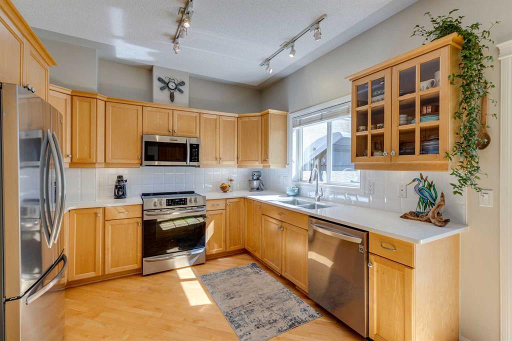 Discover this stunning three-story townhome with a walkout basement, offering an exclusive view of a serene, tree-lined courtyard. Situated in the best location within "The Landings," this home boasts 1,818 square feet of elegant living space and includes a double attached garage. KEY FEATURES INCLUDE: Three Outdoor Patios: Enjoy the outdoors with three separate patio spaces. PREMIUM INTERIOR: Diagonal maple hardwood floors throughout the main level and a maple kitchen with built-in recipe desk, new quartz counter tops and new appliances. Incredibly bright kitchen with access to the large 19-foot private patio. 9-foot ceilings throughout enhance the open and bright floor plan, flooded with natural light from numerous windows. INVITING LIVING AREA: Features a corner gas fireplace with a wooden mantle and a formal dining room. LUXURIOUS BEDROOMS: Two primary bedrooms upstairs, each with 4-piece ensuite bathrooms. One ensuite includes a large jetted tub, shower and a walk-in closet with a stacked washer and dryer. 2nd master bedroom features a soaker tub, shower and large walk in closet. VERSATILE LOWER LEVEL: The walkout lower floor includes a family room, which can serve as a third bedroom, recreation room, or office, along with a 2-piece bath and French doors leading to a 20-foot ground level patio. Don't miss out on this hidden gem. RECENT UPDATES INCLUDE: Quartz countertops July 2023, Blanco kitchen sink July 2023, 4 low flow toilets in 2023, Kitchen appliances (stove, fridge, dishwasher, microwave) July 2023, carpets throughout 2023, kitchen faucet Aug 2022, front load stackable washer & dryer Nov 2022, some Hunter Douglas honeycomb blinds in 2021. Explore every detail with our 3D VIRTUAL TOUR!