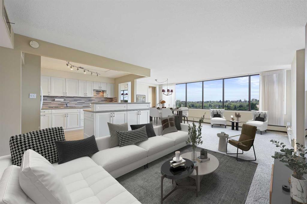 Situated on the coveted southwest corner of Roxboro House, it boasts unobstructed views of the Elbow River, South Hill, and the Rocky Mountains. The home is recently renovated and elegantly appointed with new carpets and a modern white kitchen with ample cabinet and counter space. The open-concept living and dining rooms are adorned with wall-to-wall windows that provide abundant natural light and breathtaking river views. Off the living area as a balcony to enjoy the summer sun.