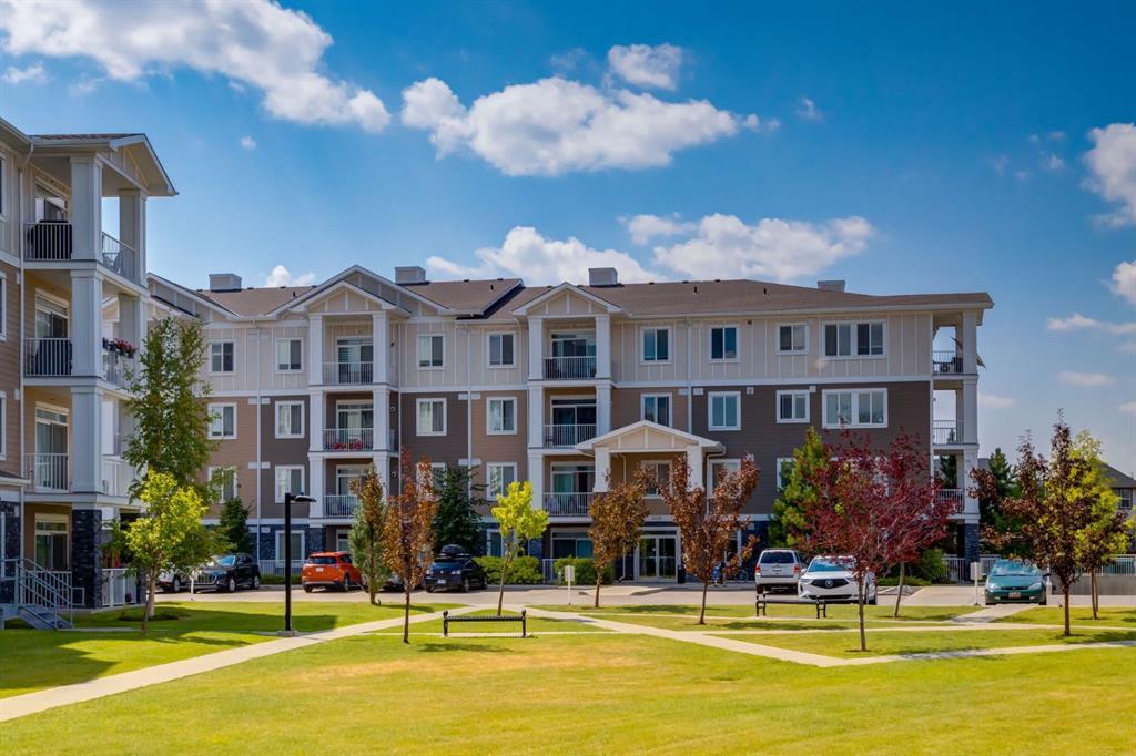 Welcome to Cranston Ridge! This air conditioned 900+ sq.ft main floor corner unit is designed for modern living with a functional floor plan, 9ft ceilings, and engineered hardwood flooring. Large windows fill the space with natural light, creating a warm and inviting atmosphere throughout. Upon entering, you'll find a spacious front foyer with excellent storage options. The kitchen is a true centerpiece, featuring beautiful full-height, two-toned cabinets, a sleek tile backsplash, granite countertops, an island with ample storage and seating, and stainless steel appliances, including upgraded fridge and dishwasher. The kitchen seamlessly flows into the spacious living room, which has great light from the large patio doors that open to your oversized patio—complete with a BBQ gas line and a gate for easy in-and-out access. The two bedrooms are thoughtfully separated, providing privacy—ideal for roommates or guests. The primary bedroom comfortably fits a king-sized bed and includes a generous walk-through closet leading to a luxurious ensuite with double sinks, a large shower, and a soaker tub. A second full bathroom and a convenient in-suite laundry area complete this fantastic condo. Additional features include two titled parking stalls (one underground and one above) and a storage locker. Cranston Ridge, built by Cardel Lifestyles, offers a beautifully landscaped setting with greenspace and ample visitor parking. Residents enjoy the convenience of nearby shops, services, and restaurants, as well as being within walking distance to the Ridge and having easy access to Stoney and Deerfoot Trails.