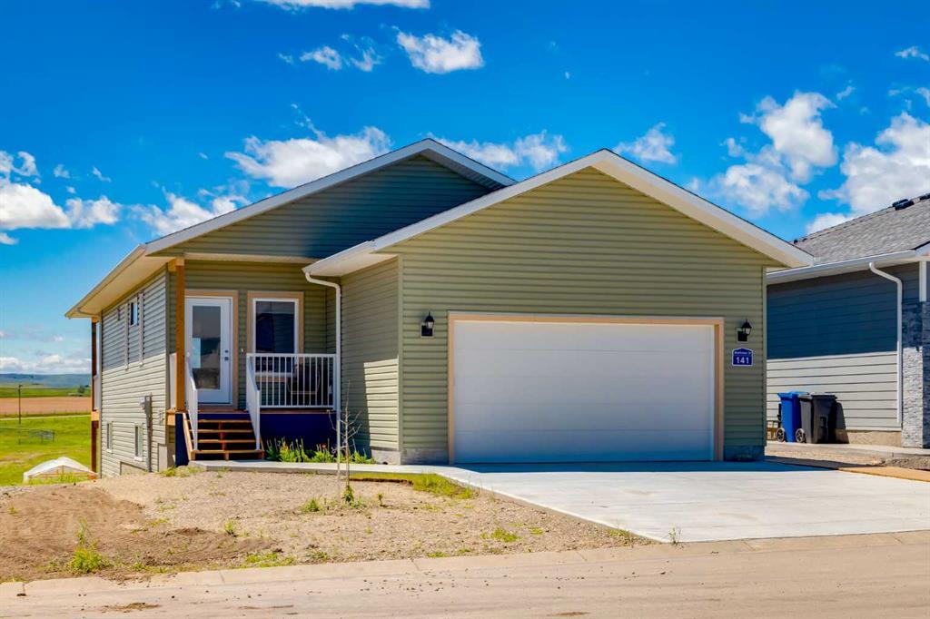 Discover your ideal retirement haven in a quaint Alberta town of Nanton. This house has stunning vistas of the majestic Rocky Mountains and picturesque foothills. Nestled amidst this scenic landscape is an 18-hole golf course, perfect for the spring summer and fall months to keep you active. Constructed in 2023, this charming 3-bedroom 1331 square feet bungalow features an undeveloped walkout basement, offering boundless opportunities. Located on a big lot with privacy in the back yard. With 2 full bathrooms and kitchen with a breakfast bar and quartz countertops. Enjoy unobstructed south and west views of lush greenspace, while having a convenient dog park practically in your backyard. Plus, benefit from nearby amenities including elementary, junior high, and high schools, completing the picture-perfect retirement setting or perfect for the a young family wanting the peace and quiet of a small town.