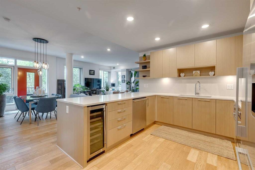 Your urban lifestyle awaits in this expansive two-bedroom plus den home. Welcome to exceptional living at Radius in Bridgeland. This home provides a sprawling floor plan spanning over 1200 sqft, along with one of the largest patios in the building. This is your opportunity to enjoy inner-city living without sacrificing outdoor space. Located across from Murdoch Park this home is bathed in natural light from the west and offers a private entrance; this is ideal for pet owners and easy access for guests. A timeless light colour palette is accented by upgraded engineered hardwood floors. The large kitchen is complete with bright white quartz countertops, Fisher Paykel fridge, Bosch Gas cooktop, Bosch Dishwasher, and a wine fridge. Space is maximized in the hotel-esque bathrooms with additional overhead storage plus motion sensor lighting. Radius is a concrete building with LEED platinum status, this ensures both soundproofing and sustainable operating costs. World-class amenities are located on each floor of this thoughtfully designed building, including 2 weight rooms, yoga studio, spin studio, package delivery room, bike/ski workshop, dog wash, car wash bay and rooftop terrace with BBQs, outdoor fireplace and private garden plots. Living in Bridgeland offers an unparalleled lifestyle with easy access to some of the best Calgary restaurants including Shiki Menya, OEB, UNA, Made by Marcus, Village ice cream, Phil & Sebastian, Starbucks, Bridgeland Market, Lukes Drug Mart, Mari bakery. This building is two blocks from the c-train, walkable to downtown, Inglewood, Kensington and the East Village Superstore and a quick 13-minute drive to the airport. Located only two blocks from the Bow River and extensive Calgary bike path system, Bridgeland is well known for its vibrancy, excellent culinary scene and quick access to all the major roadways of Calgary. This is a pet friendly building (no size restrictions) and Tom Campbell Park is a gorgeous off-leash dog park a few blocks away. This home is immaculate and has been beautifully taken care of, providing a turnkey residence for its future owners.
