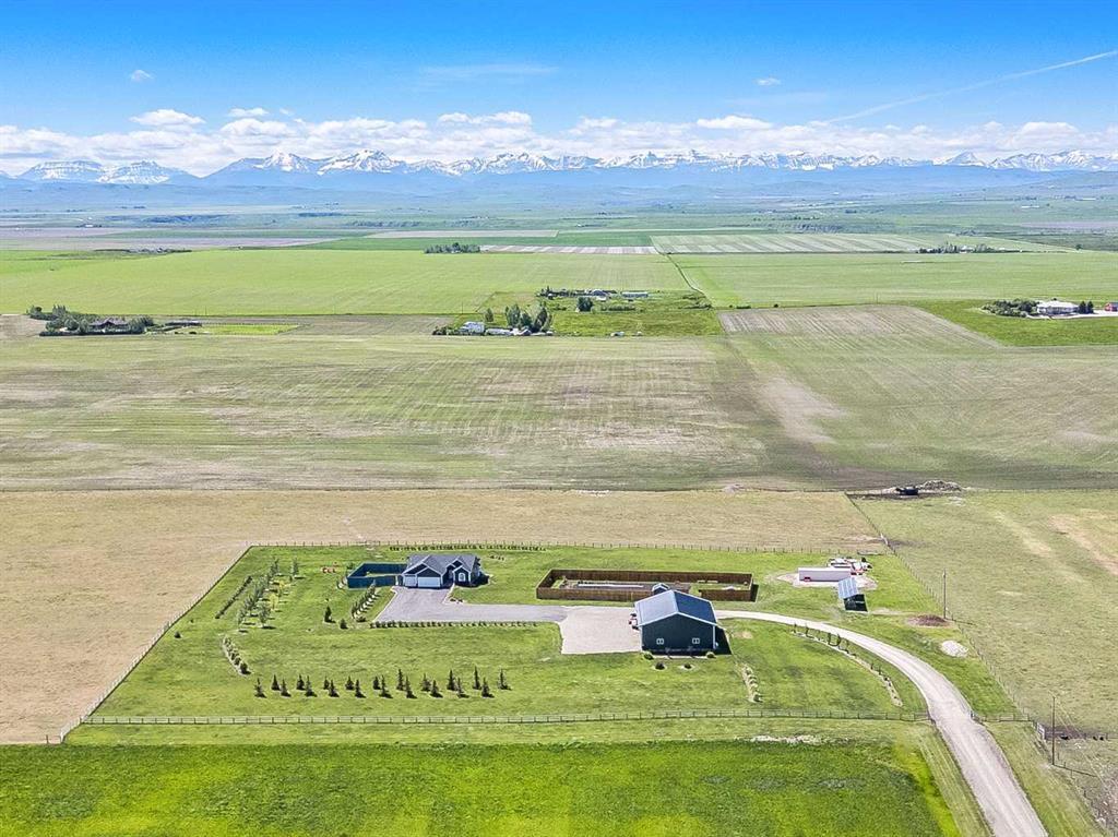 Close to 80 acres SW of High River ! Gorgeous ranch land with BEAUTIFUL mountain views. This land allows another dwelling if you need the family or friends to reside ! Gorgeous well managed diversified land with cultivated farm land, 45 acres of hay land a strong holding dug out, 20 acres of pasture . The home/shop site is fenced in with an awesome dog friendly fence ! Let the pups out to roam!! An upscale 48 X 60 heated shop with water/ 2 pc bath, 14 ft over head doors, walking doors ,16 ft high ceilings and included are attached work bench and shelving & Auto doors . Owners strategically placed home, shop and other improvements back into the property with a lovely long laneway to create a private setting and place you in the " sweet spot" for those views and the seclusion. " Wegener" built home , shop with many "high end" features and additions. This home is a beautiful 1356 sq ft , fully developed bungalow with fenced in side yard, landscape surrounding and many large windows to enjoy each hour of the day with the views and peace. Huge front plexiglass protected dura-deck at the front of home and a private wind fenced side yard. Enjoy a cool one on your 500 sq feet of protected no maint deck or head to the side yard to enjoy a game, or a fire with the family . This home is custom built with several features including " Carrara" marble counter tops and back splash, upscale appliances, white cabinetry , vinyl plank flooring , 2 fireplaces, huge pantry, 4 delightful bathrooms, good sized rooms including a nice den/TV room or could be a bedroom on main. 2 bedrooms up and 2 down and are all spacious and have great sized windows and closets. The entire home is bright and clean with 9 ft ceilings ! AIR CONDITIONING is a bonus with all the gorgeous west facing windows to enjoy the picturesque scenery. Attached huge garage with 2 doors w/634 sq ft to park your 2-3 vehicles plus storage. Garage is heated ! This property has recently been set up on SOLAR! An Energy report on this home is included in the supplements ! Huge fenced in garden area with garden shed and chicken house within. Established garden and shrubbery, perennials and well loved and cared for soil will bring you a huge garden if desired. The garden area has been fenced which is fantastic. Future use can be for your horse, small animals or what ever you choose.. Great options!! Landscaped with Spruce, poplar, huge amount of lilacs, shrubs, with watering system. Yard area has been graveled with washed gravel and all landscape is strong and growing well . Very Strong well and of course all new infastructure in 2017!! This property is timeless and borders other beautiful ranches in our Rural Foothills County.. Opportunity waits. Paved right to your gate, and approx 45 min drive to Calgary from the door. Transfer switch installed for generator awaits your choices. Head 2 miles south to " Bar U Trail" and head west !
