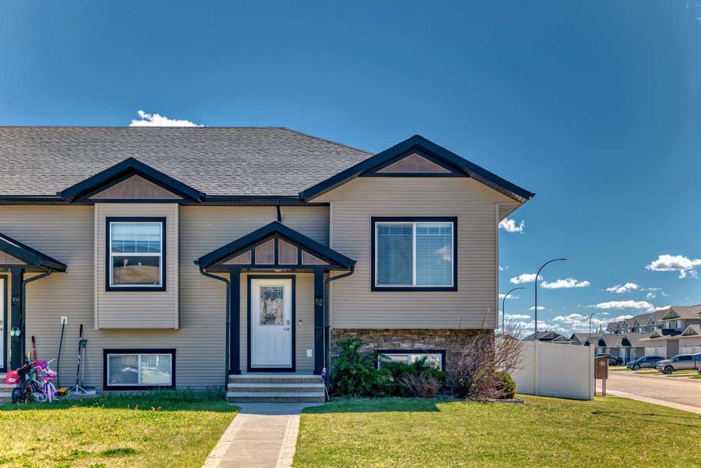 Welcome to your dream home! This stunning modern townhome on a unique pie-shaped lot offers ample space for extra vehicles or a small trailer/RV. Inside, the open-concept upper level features high ceilings, a sleek kitchen with ample cupboards and a breakfast bar, and a bright living/dining area leading to a spacious 12' x 9'11" upper deck with extra storage. The main level includes a cozy bedroom and a pristine 4-piece bathroom. Downstairs, find two more bedrooms, another 4-piece bathroom, a family room, and laundry. Plus, enjoy an extra-large shed with 8-foot standing room for all your storage needs. Located in Blackfalds, you're close to excellent schools, playgrounds, trails, the Abbey Centre, great dining, and just minutes from Red Deer and Lacombe. This home has it all – don't miss out!
