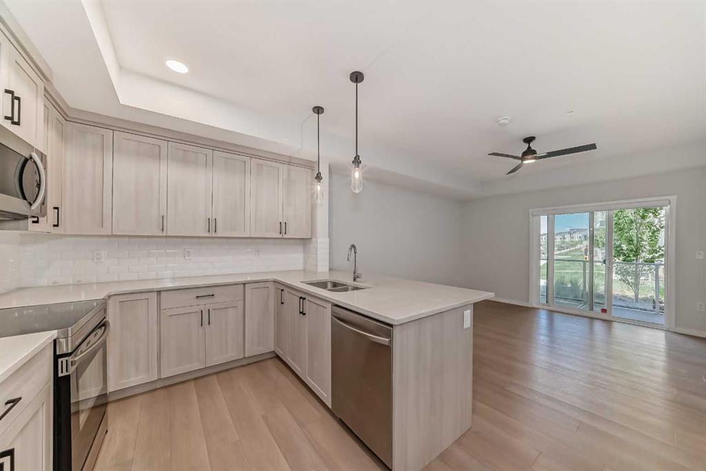 LARGE 1B1B | LIKE NEW | LVP THROUGHOUT | WEST BALCONY | TITLED PARKING | LOW CONDO FEES | An OVERSIZED (610 sqft) 1 bedroom 1 bathroom unit located in the well-established community of Harvest Hills. Completed in December 2022, it is in LIKE-NEW condition, and fully upgraded. This unit features 9-ft ceiling, LVP flooring and tiles THROUGHOUT, QUARTZ countertop, FULL-HEIGHT cabinetry, and stainless steel appliances. The large 43"x98" working island will surely impress you. A FAN in the living room adds style and functionality. There is an in-suite laundry room with ample storage space. Nestled in the tranquil corner of the building, this main floor unit has a spacious balcony that leads to the courtyard. Enjoy the sunlight and beautiful landscape from your WEST FACING BALCONY without the hassle of maintaining your own yard. It also comes with a TITLED parking stall (#136). Condo fees are just $236 per month. Quick access to Stoney Trail and Deerfoot Trail. 10 minutes from the Airport, 15 minutes from Downtown. Bus station is steps away. Shopping, dining, entertainment and wellness amenities are within walking distance. MOVE-IN READY. Great opportunity for investors (short-term rental allowed), young professionals and senior buyers.