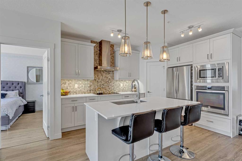 Welcome to Cranston Ridge built by Cardel in Cranston! Previously the builder show home, this heavily upgraded 2 bedroom, 2 bathroom unit on the ground floor features a open floor plan, extra large bright windows, 9 foot ceilings, tons of storage with oversized laundry closet and corner pantry, and a large east facing patio with a natural gas line! When looking at upgrades, the builder spared no expense which include things like built in stainless steel appliances, laminate floors in bedrooms, full tile shower and full wall tile back splash in ensuite, designer lighting fixtures, built in custom closets, and much more to list! This home also comes with 2 titled parking stalls and a storage locker. Very easy access to Deerfoot and Stoney. Book a showing today!