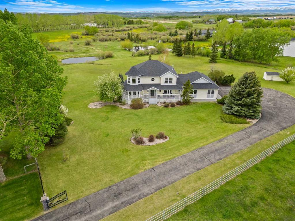 Fabulous opportunity to buy a beautifully maintained acreage just north of Okotoks with 4.32 acres of Stunning grounds and gorgeous mountain views. This home wows from the moment you drive up to the gate, you will be impressed with the tranquility, breathtaking views, mature landscaping and gorgeous wraparound porch. When you enter the home you will love the open to above entrance and abundance of natural light from all the windows. On the main floor is a large flex room - perfect for a formal sitting area, playroom or music room. A lovely living room with gas fireplace, a great place to relax after a long day and soak in those views. Entertain in the formal dining room with a meal prepped in the fabulous kitchen, comprising of built in oven, wolf gas cooktop, granite counters, lots of counterspace, central island and cabinets to the ceiling. The dining nook has doors onto the large deck so you can appreciate your land and views! Completing this level is a fabulous office/den with built in shelving, a 3 piece bathroom with granite counters and a great laundry/mud room with a sink. Upstairs is a massive master bedroom with sitting area - perfect for enjoying the sunrise, a large walk in closet with built in California closet organisers and a 5 piece EnSuite. The other 2 bedrooms are large in size and there is a 4 piece family bathroom. Did I mention every window has fabulous views? In the fully finished walkout basement are 2 more large bedrooms. A massive family/games room with a gorgeous stacked stone fireplace and a 3 piece bathroom. Step out of the walkout basement and enjoy the spacious patio (part of which is undercover). This home has a large storage room and a 3 car garage which is roughed for a future heater. The grounds on this property are amazing, you have a lovely pond area to the far south, lots of mature trees and shrubs, a lovely rock feature near the home and plenty of space for your ideas. This is an awesome family home in a great location, with easy access to Okotoks & Calgary. Don't miss out! View 3D/Multi Media/Virtual Tour.