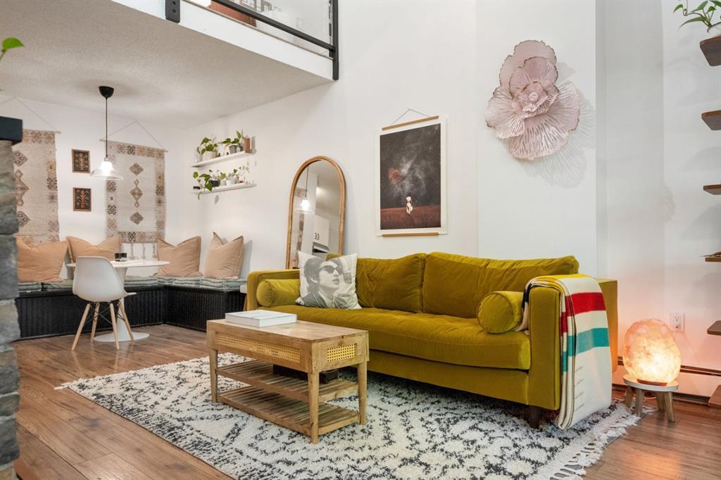 Situated on a quaint tree lined street surrounded by heritage homes in Bankview between Marda Loop and Trendy 17th Avenue this Townhouse style multi level apartment with a private yard awaits. The main floor offers a spacious foyer, soaring ceilings, a large living room with wood burning fireplace and dining room with built in bench seating, a spacious bedroom with large walk in closet, 2 piece bathroom, and galley kitchen with stainless steel appliances, butcher block countertops and white country chic cabinetry. Upstairs invites you with an open from above loft perfect for an office/den or area to unwind with a view of the sought after and admired "bubble window". The spacious second bedroom with large closet, 4 piece bathroom and additional storage closet complete the second floor. Enjoy the convenience of accessing the building from the unit on either the 1st or second floor. These trendy ground level lofts offer outstanding outdoor private garden patios with a partially covered area to enjoy regardless of the weather. The main floor bedroom closet can easily be converted to in suite laundry or you can utilize the laundry facilities in the building. The building features a stunning furnished rooftop patio with unobstructed panoramic city views. This trendy loft is currently being used as an office (board approved). New windows have been installed for all the units in the building. Ample street parking is available as well as an assigned parking stall for the unit at the rear of the building. There is a large storage area located until the stairs, 3 generous closets and plenty of room for a shed outside in the yard should you need additional storage space. Exterior landscaping is set to be started and completed this year. Move in this summer and enjoy walking down town, dining on 17th Avenue or visiting Marda Loops trendy shops, restaurants and coffee shops. Bankview is a fantastic vibrant urban community close to several parks, playgrounds, schools, transit and major amenities. Budgeting is made easily with all utilities and exterior maintenance being covered within your fees aside from electricity.