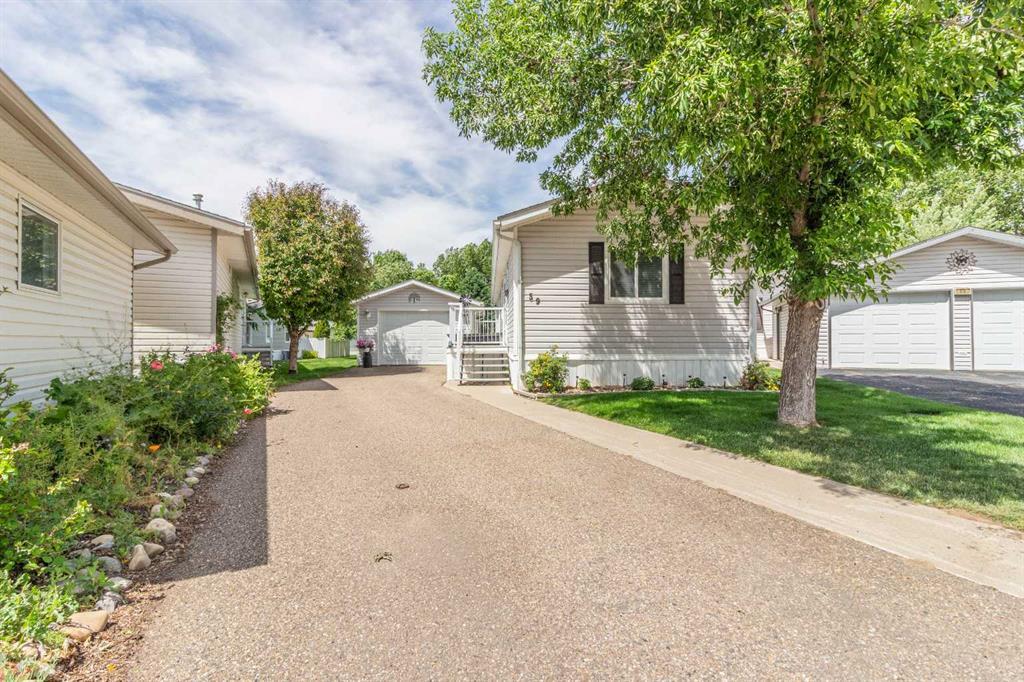 Maintenance Free Living in Meadowlark Village ! This impeccably kept , age restricted ( 35+ ) park offers peace of mind and easy access to all amenities. Located near all of the services and shopping the south end of town has to offer, this bright and open 3 bedroom , 1 bathroom , 979 sq ft. unit features a vaulted ceiling , a nice open living / dining area , a spacious primary bedroom with ample closet space , 2 extra bedrooms , a laundry nook , and includes a full appliance package; all MAIN FLOOR ! There is an insulated , detached 14 x 24 garage plus an extra long driveway for parking , and a nice sitting area on the patio just off the garage. Pets are allowed with park approval. The lot fee covers all snow removal and groundskeeping , as well as the water and sewer portion of the utilities . Plus a clubhouse for exclusive use by the residents! Some updates include new flooring, furnace (2021) , and shingles approx. 7 years old. Great place to downsize to yet keep the independent lifestyle afforded by a detached dwelling !