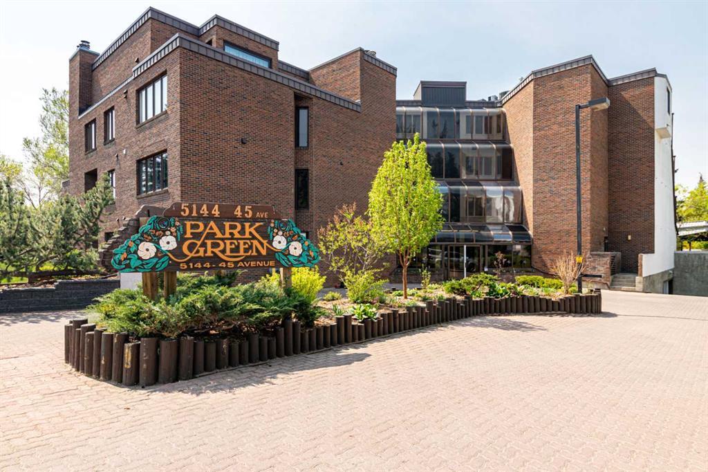 PARK GREEN MAIN FLOOR CONDO in highly sought after Woodlea location. Lots of square footage in this 2 bedroom unit! The Primary bedroom is huge with big windows for natural light & a handy 2 piece ensuite. There is a Murphy bed in the 2nd bedroom to free up space & a 4 piece bathroom adjacent with tons of vanity & storage space. Beautiful kitchen with s/s appliances & lots of workspace, newer backsplash & counter tops with upgraded cherrywood cabinets. There is a pull-out pantry & a full sized side by side washer & dryer in unit. Dining room can accommodate a large table for entertaining & the living room is perfect for socializing. "Family Room" can function as office space or exercise area while enjoying the outdoor views. Step out on to the south facing patio for glorious sunshine & views of the park, where walking paths are right outside your door! Secure underground parking stall with 6x4 storage in front, a car wash & wood working room & added bonus of a Rooftop A/C Unit to keep things cool in the summer! Close to shopping, amenities, walking & biking paths - a can't beat location!
