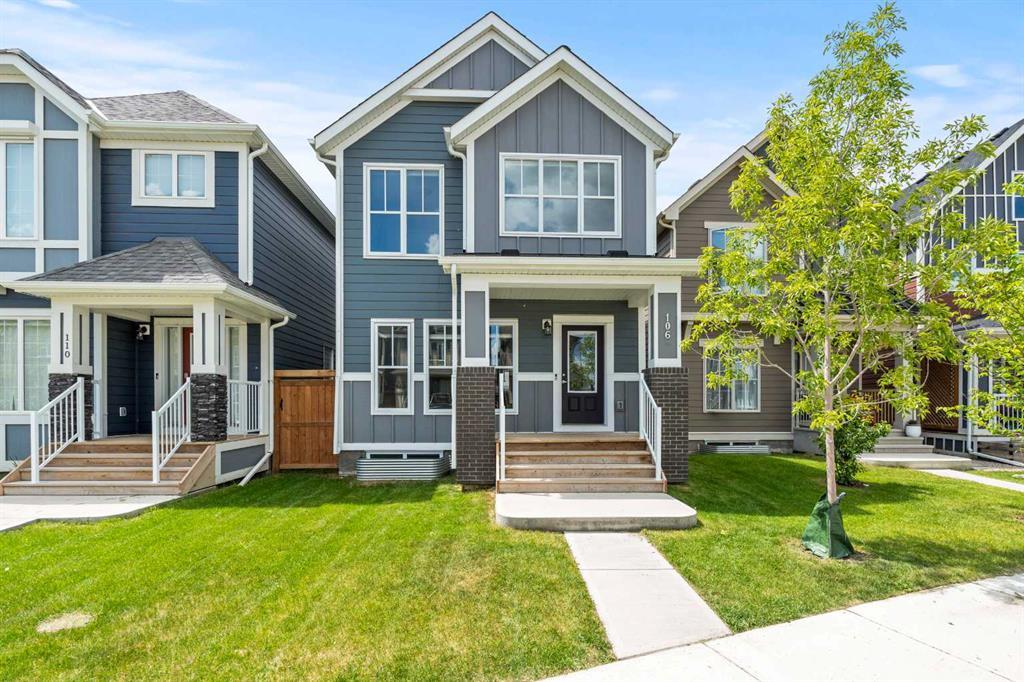 Welcome to 106 Magnolia Square SE, located in the highly sought-after lake community of Mahogany. This impeccably maintained home spans 2320sqft of total livable space and boasts numerous upgrades, including an air conditioner, large windows, a beautiful front porch and a side entrance, providing a promising blend of comfort, style, and functionality. As you step inside, you'll be greeted by the inviting ambiance of 9-foot ceilings on the main floor. The living room features a stunning feature wall and an electric fireplace, creating a cozy atmosphere perfect for gatherings. Flowing seamlessly from the living room is the dining area, leading to a spacious kitchen that showcases quartz countertops, stainless steel appliances, an oversized window for natural light, an island ideal for entertainment, and a convenient walk-in pantry. A half bath completes the main level, ensuring convenience for guests. Upstairs, the home offers three generously sized bedrooms, including a primary suite with a large walk-in closet and an ensuite bathroom equipped with a dual vanity for added luxury. An additional full bathroom and a laundry room add practicality and ease to daily living. The basement is designed for entertainment and relaxation, featuring a large entertainment area, a full bathroom, secret storage located behind the bookcase and an extra bedroom for a large family or guest providing ample space for various needs. The basement also features a den/office space for all your work from home needs. The backyard is a true retreat with a beautiful 2 year old hot tub and gazebo, complemented by stamp concrete, a spacious composite deck ideal for outdoor dining and relaxation with extra storage under the deck. A well-maintained patio area, dog run and an oversized shed offering additional storage and convenience. Located in Mahogany, residents enjoy access to the community's prestigious lake amenities, and walking distance to parks, schools, shopping, and more, making it a highly desirable place to live. This home combines modern upgrades with comfort and functionality, offering a lifestyle of luxury and convenience. Don't miss the opportunity to make it yours!