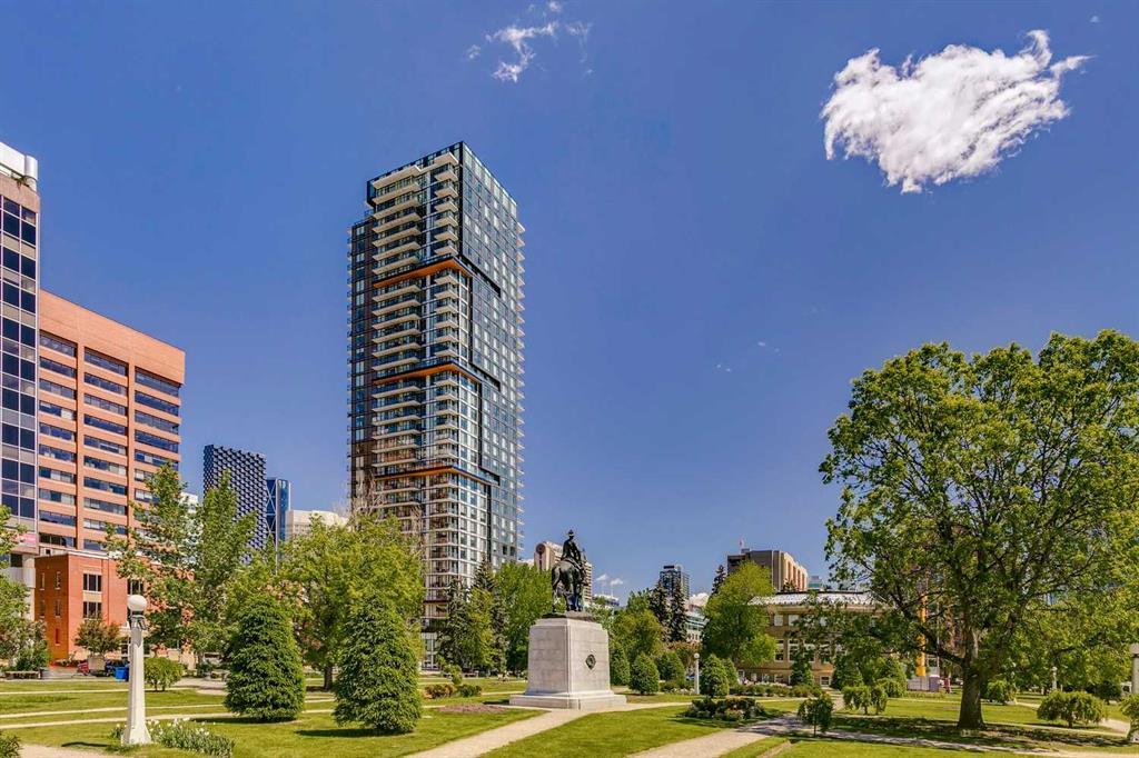 This stunning corner, end unit is located on the 25th floor of the esteemed Park Point building in the vibrant Beltline community, presents an exceptional blend of modern sophistication and urban conveniences. Spanning 935 sq. ft with 9' ceilings, this residence boasts 2 bedrooms, office/den plus 2 full bathrooms, offering a spacious layout that maximizes comfort and functionality. As you step inside, you're greeted by an abundance of natural light flooding through large windows. The captivating vistas of downtown, Central Memorial Park and the majestic Rocky Mountains creates an inviting backdrop, perfect for unwinding or entertaining guests. Designed for the discerning chef, the open concept kitchen is a culinary delight, featuring granite countertops and backsplash, complemented by chic white cabinets and stainless steel appliances, including a gas cooktop. The expansive island doubles as a breakfast bar, while a dedicated coffee/beverage station adds a touch of luxury to your morning routine. Living and dining spaces both with large windows and southern views. The primary bedroom is a serene retreat, complete with a walk-through closet leading to a luxurious 6-piece ensuite, boasting a soaker tub, dual sinks, and a separate shower. A second bedroom offers a cozy retreat for guests with more outstanding city views plus ample storage space. An additional 4-piece guest bath with an oversized shower plus in-suite, full-size laundry and air conditioning, ensuring comfort year-round. Parking is a breeze with two titled parking stalls in the heated underground parkade, accompanied by two storage lockers for added convenience. The pet-friendly Park Point building offers an array of amenities, including a car/pet wash bay, fitness center, sauna and steam room, party room, and a tranquil courtyard garden with a BBQ station, providing the perfect setting for social gatherings or quiet relaxation. Park Point is truly a community on its own and must be experienced to be appreciated! Central Memorial Park and the Memorial Park library are just across the street, while Haultain Park with tennis courts is just steps away. Enjoy nearby culinary hotspots, while the bustling shops and restaurants of 17th Avenue are within easy reach. For sports enthusiasts, the proximity to the Saddledome ensures easy access to thrilling events, while the +15 entrance just one block away provides seamless connectivity to downtown. Experience the best of urban living in this meticulously crafted residence, where luxury meets lifestyle in the heart of Calgary's vibrant Beltline district.