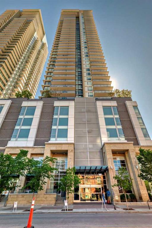 Step into luxury with this exclusive 1-bedroom, 1-bathroom condo on the 12th floor of The Guardian complex. This unit offers spectacular panoramic views of downtown Calgary that will leave you breathless. The bright and open floor plan is accentuated by a wall of windows and high ceilings, flooding the space with natural light. The heart of the home, the kitchen, is a chef's dream featuring quartz countertops, an imported Armony Cucine kitchen, and top-of-the-line stainless steel appliances, including an AEG induction cooktop and built-in oven and a built-in refrigerator. With ample cabinetry, this massive kitchen provides abundant storage space for all your culinary needs. The spacious bedroom easily accommodates a king-sized bed and a dresser, ensuring your comfort. The cleverly designed 4-piece bathroom includes a closet housing a stacking washer and dryer, optimizing your living space. Enjoy breathtaking cityscapes and serene sunrises/sunsets from the huge balcony, perfect for relaxation and entertaining. This condo comes with a titled underground parking stall, a storage locker, and air conditioning. The Guardian complex offers outstanding amenities, including a fitness facility, yoga studio, recreation room, outdoor terrace, bike room, workshop, and a full-time concierge/security service. Located in a prime area, you're just steps away from the vibrant downtown life, including the Saddledome, Stampede Park, the trendy boutiques and restaurants of 17th Avenue, the C-Train, and scenic walking paths along the Bow River. Call now to book your showing and make this luxurious condo your new home!