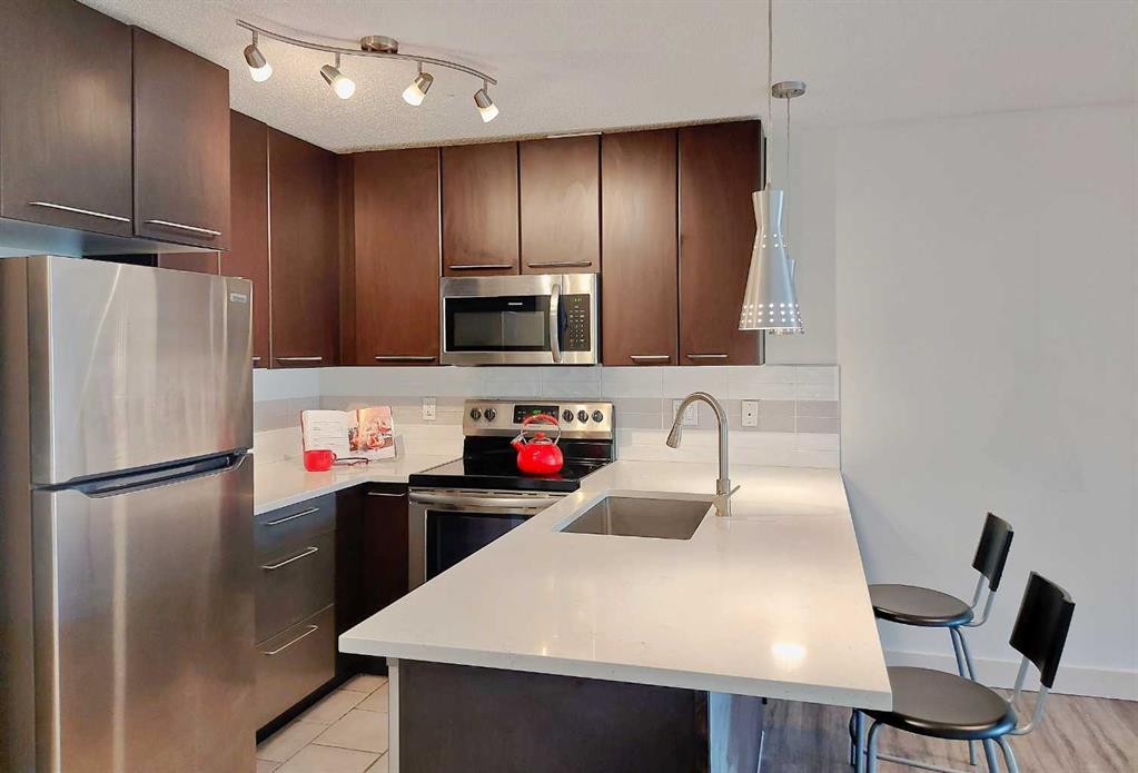 Discover elegance and convenience in this meticulously updated 1-bedroom unit ideally located in Lincoln Park adjacent to Mount Royal University, perfect for students, faculty & staff, or savvy investors. Recently refreshed with a new coat of paint, the interior boasts a renovated kitchen and bathroom. Located on the top floor, this exceptional unit features a coveted titled underground parking spot. The open floor plan, rare in its functionality, includes a den and showcases a serene courtyard view alongside a charming corner gas fireplace. Step inside to experience the luxury vinyl plank flooring in the living and dining areas, complemented by plush carpeting in the bedroom featuring a ceiling fan, walk-in closet, and a renovated 4-piece cheater ensuite. The ensuite dazzles with a new tower shelf, curved shower rod, and a quartz vanity top with new fixtures. Cook and entertain effortlessly in the gourmet kitchen equipped with abundant cabinet space, stainless steel appliances, and an expansive 8-foot quartz breakfast counter. Start your mornings on the peaceful 10' x 8' balcony, perfect for enjoying your coffee or preparing for an evening barbecue with gas hookups readily available. Situated mere steps from Tim Hortons and within quick access to Crowchild and Glenmore Trail, this prime address offers easy access to all essentials. Mount Royal University and nearby amenities are within walking distance, including a convenient strip mall and dining options for every palate. Residents also benefit from exclusive building amenities such as an indoor workout room, party room, and a bookable guest suite, all within a pet-friendly environment. Additional features include titled underground parking with ample visitor spots, a storage locker, and multiple bike storage rooms. Embrace the future with TELUS PureFibre connectivity, ensuring seamless WiFi integration throughout the building. More than a home, this exquisite unit is a sophisticated retreat designed for modern living. Don't miss your opportunity to enter the market at this prime location, perfectly suited for those seeking comfort, style, and convenience in Calgary's vibrant southwest.