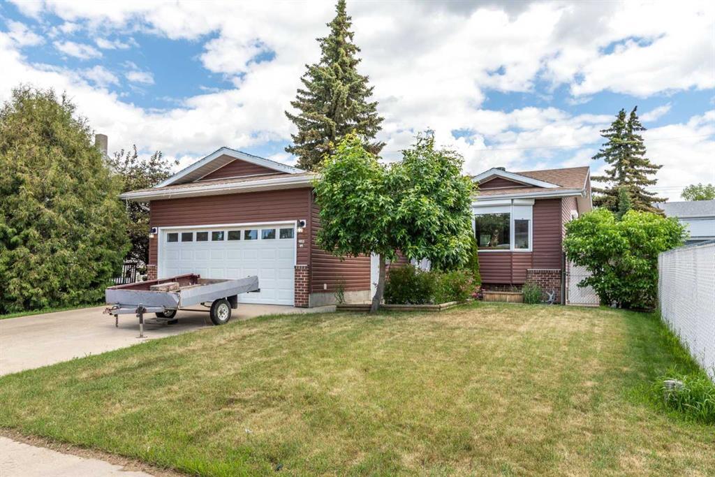What a nice place to call home! This is a solid, 4 bedroom family home, just a block off main street in Stettler, AB. One block off of main street, this home is in a convenient location as it is a short walk to grocery stores, professional services, banking, medical clinics, boutique shopping, coffee shops, and so much more. Inside, this home flows from room to room, and is unified with oak trim and doors. The front entrance has access to the two-car garage and opens up to a bright living room with bay window and dining room. Next is the kitchen which has oak cabinets, white appliances, and a bay window facing the back yard. Down the hall are two nice-sized bedrooms including an ensuite with shower. There is a bright main bathroom with tub and shower. This home has an awesome main floor laundry room with front load washer and dryer on pedestals and a wall of cabinets for storage. Downstairs, there is a huge family room which would be a great spot to entertain or for the kids to play. There are two more bedrooms, an office, and a spacious bathroom with a shower. This home stands out with deep red siding and brick accents. The front yard has trees along one side and fencing along the other, giving you some privacy. There is a wide cement pad in front of the garage, so you have off street parking. The back yard has a roomy deck, a garden shed, and is fully fenced which is nice for the pets and younger children in the family.