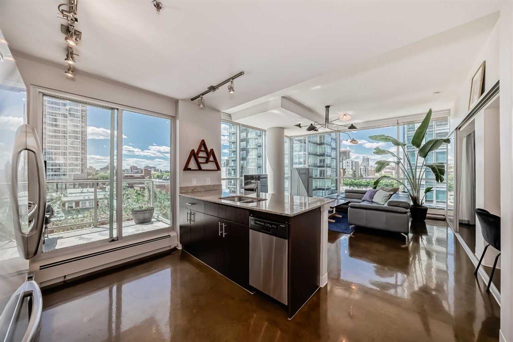 This downtown 1 bed, 1 bath condo boasts amazing city views is ideal for first-time buyers and investors. Located in the vibrant Colours by Batistella building, it's just moments from the bustling city center. The open-plan kitchen and living area with balcony access is perfect for entertaining. A built-in desk provides a convenient home office space. The bedroom features stunning views, a walk-in closet/laundry room, and a 5-piece ensuite bathroom. Enjoy proximity to restaurants, shopping, gyms, and the beautiful Elbow River, with Lindsay Park just a few blocks away.