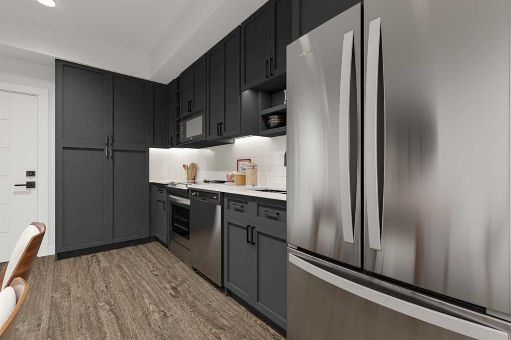Boasting 2 large bedrooms and 1 full bathroom, with North-facing balcony is designed for comfort, convenience and style. The large deck offers expansive views and invites relaxation and entertaining under Calgary's skies. The open concept layout enhances the airy, bright atmosphere, all day natural light complemented by executive finishes throughout, including quartz countertops and a stainless steel appliance package. Builder's size measures 785 SF. In unit stackable full sized laundry. Laundry room with tonnes of storage. Front closet with tonnes of storage.