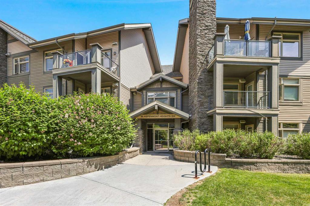 Welcome to Aspen. This charming 2-bedroom, 2-bathroom residence features a practical layout. The spacious kitchen is equipped with maple cupboards and expansive countertops. The master bedroom includes a 4-piece en-suite and two closets, while the second bedroom has direct access to the main washroom. Enjoy the convenience of in-suite laundry and a good-sized balcony, perfect for summer BBQs. The unit remains cozy in winter and cool in summer, facing east with a serene view of trees. Included are two titled underground heated parking stalls. Located in the desirable Valmont community of Aspen Woods, this meticulously maintained apartment offers a modern open-concept design. The kitchen showcases large countertops and abundant cabinetry, ideal for culinary endeavors. Both bedrooms are generously sized, with the primary bedroom featuring a luxurious en-suite with a soaker tub, and walk-through closets. Step out onto the balcony for peace and privacy amidst lush greenspace. The building amenities include a fitness center and guest suites. This prime location is within walking distance of Guardian Angel School and Aspen Landing shopping center, offering Safeway, Starbucks, dining options, and easy access to public transit, walking paths, and playgrounds. With proximity to West Side Rec Centre and convenient access to Stoney Trail, this home provides effortless connections to downtown, the airport, and the mountains. Don't miss out on the opportunity to call this exceptional apartment your new home. Contact us today to arrange a viewing!