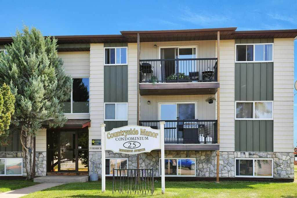TOP FLOOR END UNIT CONDO FOR SALE! Make this lovely low-maintenance property your new home or add to your investment portfolio. Located on a quiet street with only a short walk to restaurants, shopping, and schools. This unit offers a top floor experience with newer paint and laminate flooring. Galley style kitchen leads through to the dining area. The large living area accommodates comfy furnishings, and a sliding door out to the west exposed covered balcony. Two spacious bedrooms, four piece bathroom and in-suite laundry complete this space. Your vehicle will be parked just outside the building on the paved parking area. Electrical plug-in available. This is a pet-friendly building with a weight limit of 20 pounds for dogs. If you are looking for a quiet street close to the action, then look no further than Countryside Manor.