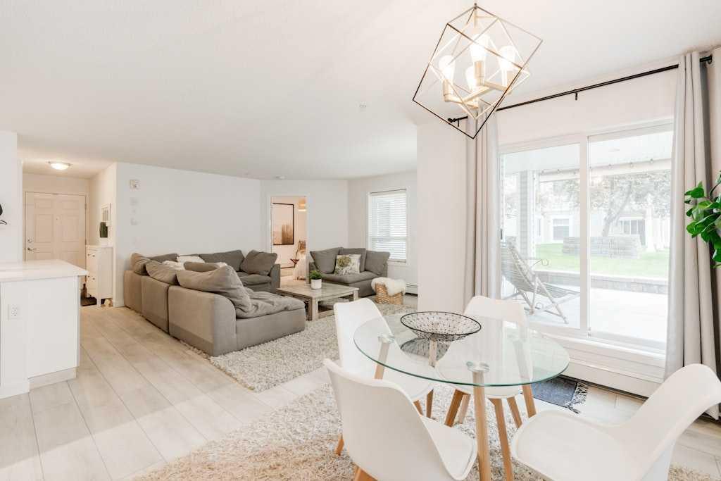 Wow! A Magazine-Worthy Residence that Delivers it ALL – Over 1000 SF of Undeniable Style, 2 Large Bedrooms, 2.5 Bathrooms, a Covered Patio overlooking the Treed Green Space, Gas Fireplace, and Titled Underground Parking and Storage! This lovely, renovated corner suite is a model of quality, design, and relaxed comfort in the amenity-rich S.W. community of Shawnessy. Several windows allow light to flood the open kitchen, living and dining rooms while providing pretty views of the green space and pathway beyond. Stylish cabinetry and quartz counter tops highlight the well-appointed kitchen featuring stainless steel appliances, pantry closet, and double-wide peninsula with additional cabinet storage. The expansive dining area accommodates a large table and credenza while providing access to the large, covered patio. The wide plank LVP continues into the spacious living room with gas fireplace perfect for enjoying on those cooler evenings. The thoughtful layout smartly situates the two primary bedrooms in opposite corners of the unit where each boast their own private ensuite. Completing this stunning residence is a convenient powder room and in-suite laundry and storage as well as titled underground park and titled storage. The complex also has a secure bike room. Located steps to shopping, restaurants, the YMCA, transit, Fish Creek Park, and entertainment, this exceptional property delivers it all! Wow!