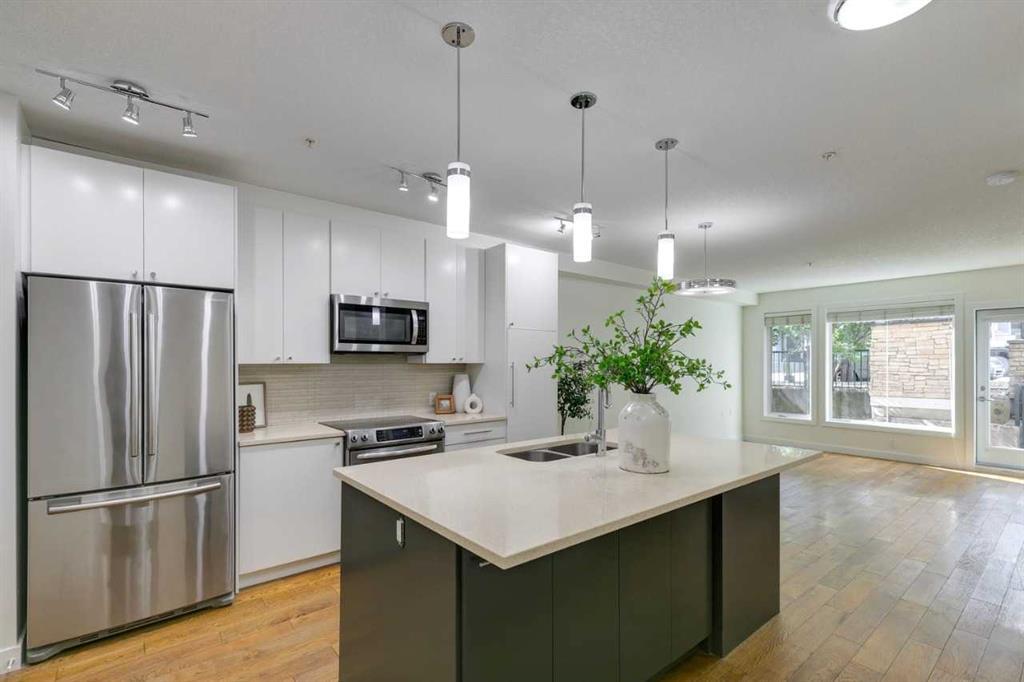 Private entry walkout unit with a large south facing patio centrally located in the attractive community of Lower Mount Royal, and seconds away from 17th Ave. This unique 2 bdrm/ 2 bath unit boasts 857 sq.ft. of stylish living space & is highlighted by 9 ft ceilings throughout, wide plank engineered hardwood flooring, & over sized windows that offer an abundance of natural light. The spacious executive kitchen will continue to impress with granite counter tops, extended modern cabinetry, Stainless Steel, an over sized island with a built-in wine fridge & a custom built-in office nook. The large open concept living room & dining area flow into the kitchen seamlessly making it the perfect space for entertaining. The master bedroom offers 2 generous closets, a large bright window & a unique 4 piece ensuite with a separate stand-up shower and bathtub. Complete with in-suite laundry, titled underground parking & storage.