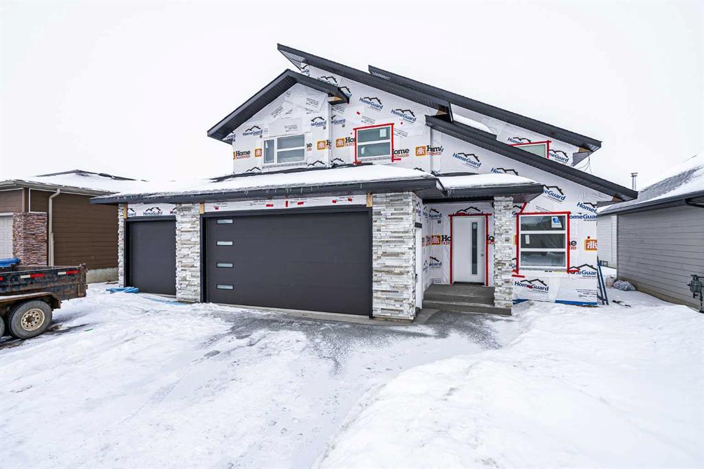 This custom home plan is everything you have been looking for and more... Custom wedge style roof lines add a modern feel to this home- upgraded Hardy board siding and detailed stonework set this home apart from other homes in this price range!! Add to this large daylight 2-storey window placement in the main floor living area making natural light flood inside this home- you will love the oversized triple attached garage, Custom kitchen and quartz countertop, vinyl plank flooring, main floor laundry, open concept living, U-shaped kitchen area, decorative main floor fireplace, fully finished basement and exceptional location within a gate community. Personalize this home to your own color choice by reaching out early in the construction process. Lakeshore estates is an upscale gated community with walking trails and common area greenspace/playground areas that are exclusive to the residents in this development - a great place to raise a family!!