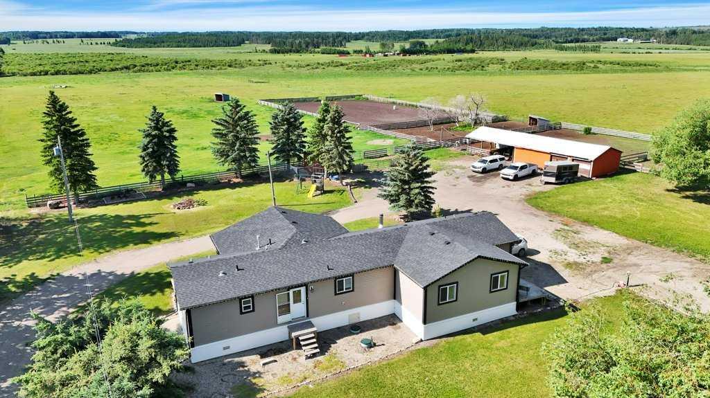 Take a look at this nice little hobby acreage set up along Hwy 11 on 9.24 acres. The 2014, 20 x 76' SRI Home feels open and roomy with a 12 x 24' addition that provides a nice big boot room at the back door and a fourth bedroom or home office space. The spacious central kitchen and living room feature an island, wood stove and patio doors that open to the big covered deck that extends along the south side of the home. The master bedroom has a three piece ensuite with a walk in shower and patio doors that also open to the front deck where there's a soft tub just waiting for you to climb in and relax. The laundry room has it's own exterior access and on the west end there are two additional bedrooms (one a very good size with a walk in closet) and a full bathroom. The outbuildings include an older 40 x 22' garage/workshop that has a lean to for additional covered parking and shelter, a storage shed, and dog kennel. If you're an equine enthusiast you'll love the large riding arena, plus a couple of pens, shelters and lots of pasture for the critters. The propane tank is rented and the portable panels will be going.