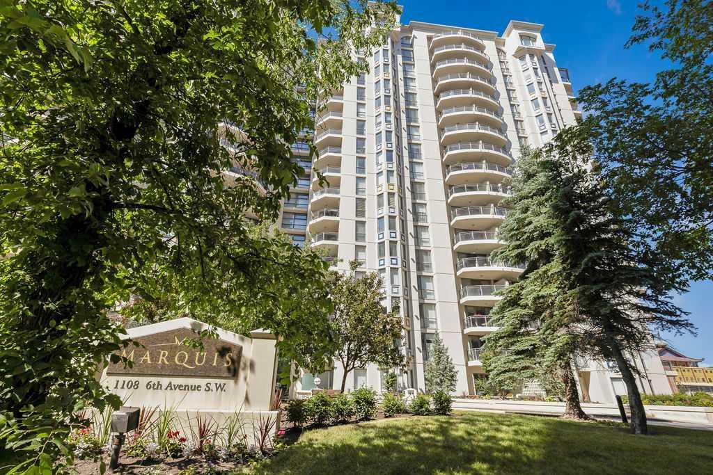 Welcome to The Marquis in Downtown Calgary. This 2 bedroom + 2 bath unit offers breathtaking river views from the 13th floor! Imagine coming home after your day out in the bustling world to this oasis. Enjoy a chilled or warm beverage on the spacious balcony while taking in the views and immediately decompress from your day. This will be your new sanctuary. Offering over 1000 sq ft of living space, open concept living-dining-kitchen + 2 bedroom that are separated by the living room. A wonderfully, thoughtful design is happening here. In the kitchen find black granite countertops with space to accommodate a few bar stools. There is a gas stove, refrigerator with water dispenser, dishwasher and microwave. In the colder months switch on the fireplace to add an extra cozy ambience. The foyer is tiled and has TWO mirrored closets. Yes! Much space for shoes, coats, and more shoes. The laundry room is discreetly tucked away with some useful shelving. Storage is not an issue in this unit. Stepping into the primary bedroom you will find TWO more mirrored closets, an ensuite with yet another storage space for more shoes…suitcases, maybe a raft or even a paddle board! Enjoy a soak in the deep tub then step out onto the heated flooring. (both bathrooms have heated flooring) You may never want to leave this spacious primary bedroom as it also has spectacular views and the curved window has a perfect spot for a lounge chair below it. The guest room is located down the hall behind the living room next to the 3-piece bathroom. There is a titled underground parking stall and yes..a storage locker perfect for a winter set of tires, tree or more shoes…This place is waiting for you and we can’t wait for you to view it! Contact your favorite realtor to book your private showing.
