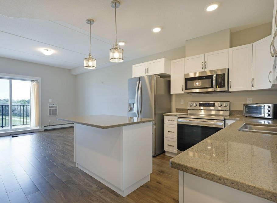 Welcome to this beautiful 55+ condo located in Meadowbrook. This suite encompasses 844 sq ft of lavish living space, featuring 2 bedrooms, 2 full baths, and 1 premium, titled underground parking space. As you enter, this unit welcomes you with an abundance of natural light, the open concept layout flows seamlessly from the kitchen into the living room. Showcasing a modern kitchen that is equipped with pristine white cabinetry, quartz countertops, and stainless-steel appliances. Sliding door from the living room leads to an oversized balcony, perfect for lounging on summer days and also has 2 storage spaces. There are 2 generously sized bedrooms, including the primary complete with a 4-piece ensuite. An additional 4-piece bath and in-unit laundry is available for your convenience. Situated in a great location, offering convenient access to highway 1, making commuting and exploring the nearby areas a breeze. Enjoy proximity to playgrounds, restaurants, shopping, and recreation areas. Whether you're searching for an excellent retirement home or an outstanding investment opportunity, this remarkable property caters to both. This secure community is designed for adults, with high-quality construction and luxury finishes. Call your favorite Realtor & book your viewing today!