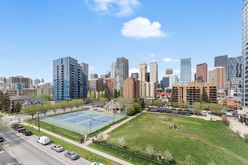 Welcome to this stunning 2-bedroom, 2-bathroom condo located in one of Calgary's most coveted Beltline buildings. This exceptional corner unit offers unobstructed views of the city skyline to the north and picturesque westward vistas, all while overlooking a tranquil park. Recently repainted and ready for a new owner. The open-concept living area is bathed in natural light, creating a bright and inviting space perfect for both relaxation and entertainment. One of the few buildings in the Beltline to boast a large, wrap-around patio, this expansive outdoor space provides ample room for dining, lounging, and enjoying breathtaking panoramic views. The master bedroom features a private ensuite bathroom and generous closet space, offering a comfortable and secluded retreat. A well-positioned second bedroom and additional full bathroom and in-suite laundry room make this condo ideal for couples, small families, guests or a home office setup. The kitchen includes loads of cupboard space and a functional layout, with potential for future updates to suit your personal style. With small upgrades over time, this unit leaves ample room to modernize and customize to your tastes, making it a perfect opportunity for those looking to add their own touch. Situated in the heart of the Beltline, you’re just steps away from both 1st Street and 17th Avenue which offer vibrant dining, shopping, and entertainment options, as well as convenient public transit access. This building is also conveniently situated near the Elbow River and Lindsay Park, offering easy access to nature, running, and biking trails. Don't miss your chance to own a piece of Calgary's skyline.