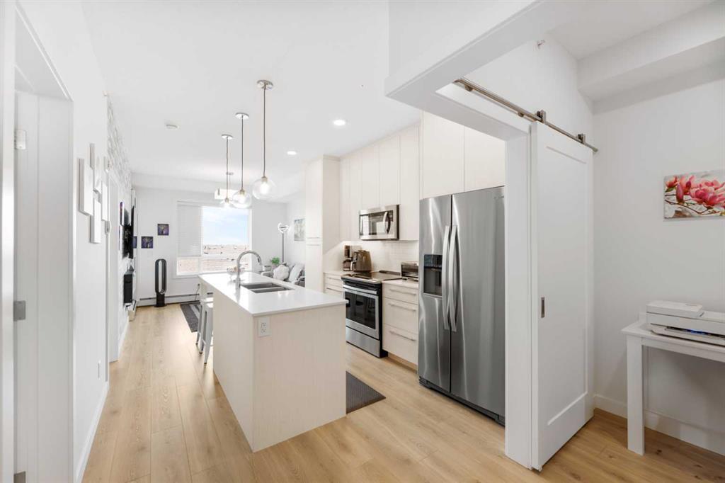 Welcome to this pristine 1 bedroom, 1 bathroom apartment that comes with titled underground parking. As you enter, you'll notice the meticulous care the current owner has invested to maintain its new condition. Situated on the top floor, it offers a view over the eastern buildings and the quietude of having no upstairs neighbors. The residence features a smart door lock and smart light switches, which remain for your convenience. The kitchen boasts floor-to-ceiling cabinetry, providing ample storage, and the stainless steel appliances are in like-new, undamaged condition. Luxury Vinyl Plank flooring and ceramic tiles grace the bath and laundry areas. For those who work from home, there's a superb computer/office space with privacy doors. The shower has been upgraded with a new shower head and wand, complemented by a chic medicine cabinet above the toilet. The living room is welcoming, with designer wallpaper and an included electric fireplace. Enjoy the outdoors bug-free with an upgraded balcony sliding screen door. The laundry room offers additional storage, and the machines are well-maintained. The complex features a party room for events, a theater room in building 2000, and a full gym, spin and yoga studios, and a pet spa in building 1000. Ample visitor parking is available. Ensure you don't miss out on this exquisite apartment – book your viewing today!