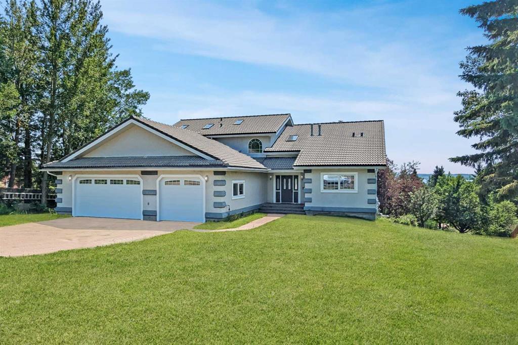 Discover this stunning spacious lake home the family will love, just steps from the beach! Two-stories of boundless lake views featuring three bedrooms, main floor office, a walkout basement, and direct access to the lake via a park reserve. Modern stucco exterior, long lasting concrete roof, triple car oversized heated garage with paving stone driveway offers plenty of room for parking inside or out. Not to mention the toy storage under the garage accessible with its own overhead door facing the lake. Inside, the open foyer leads to a breathtaking living room with vaulted ceilings, wood beams, and walls of windows overlooking the lake. A stone fireplace with copper mantel and slate hearth serves as the cozy focal point. The formal dining room provides amazing views, with garden doors opening to an expansive balcony and a beautiful backyard overlooking the lake. The kitchen replete with white cabinetry, quartz countertops, and high end stainless steel appliances, has many classy features like paneled ceiling, under cabinet lighting and dual built-in ovens. The kitchen nook with breakfast bar, bench seating and drink cooler opens as well to the massive balcony. Finishing off the main there is a 2-piece bathroom at the garage entrance, a large office/den with a 3-piece bathroom. The upper floor has an inspiring landing overlooking the foyer as well as the living room and stunning lake view. A study with dual French doors, a lovely stone gas fireplace and more garden doors leading to the upper balcony, is where the best views can be experienced. Next to the study the main bedroom has a home spa with jetted tub, double vanities, a glass shower, walk-in closet with a second washer and dryer set. The walkout basement is a dream come true with loads of view filled windows, solid wood and stone details, wet bar, wood-burning fireplace plus two bedrooms, a 3-piece bathroom and more doors to the patio and fully fenced backyard. Gates lead through the park reserve and only steps away is the beach with all it has to offer including boating, water skiing, not to mention winter fun too. 10-minutes from Sylvan Lake and Bentley, excellent boat community boat launch, sandy beach and low shoreline water levels great for kids just steps away. Front image and living room photos have been virtually enhanced and staged.