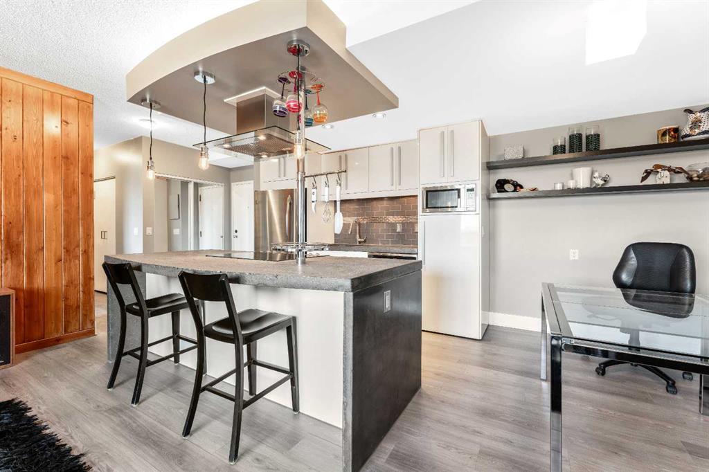 Sunday's Open House is Canceled. Come check out this modern 1-Bedroom condo with stunning views and amenities! Discover urban living in this trendy 1-bedroom condo, perfectly located in the heart of Calgary. This stylish unit features a large bedroom that comfortably fits a king-sized bed, offering you a serene and spacious retreat. It has a modern, relaxed vibe and the roomy living room provides ample space for relaxation and entertainment. The masterfully built wraparound custom cement island and countertops in the kitchen add a touch of contemporary elegance to your culinary experience. Check out the Sauna, workout area with showers, and a party room on the main floor of the building plus two rooftop patios with amazing views! The insuite storage room includes laundry hookups for your own stackable washer and dryer if desired, and as an added bonus, the convenient coin-operated laundry room on your floor is a bargain! Perfectly situated, this condo is just a short walk from The Saddledome, Stampede Park, restaurants, shopping, parks, and more. Embrace the vibrant lifestyle that Calgary has to offer with this exceptional Beltline Condo unit. Schedule a viewing today and make this stylish residence your new home!