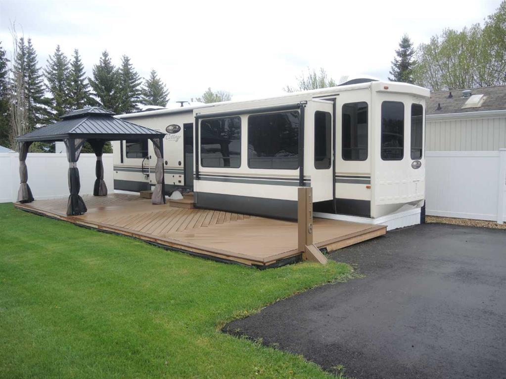 Immediate Possession on this Awesome summer retreat at Points West Resort in Sylvan Lake. Relax in this nearly new 2018 Cottage by Cedar Creek Destination trailer only used 3 seasons (on occasional weekends) on a 39' x 65.5' serviced lot. The trailer is 40' long and boasts 3 slide outs, a king size bed, large shower, full size fridge, a dishwasher, washer and dryer, large living space, 2 TVs, a fireplace, 2 Lazy Boy chairs and a "Hide a Bed". The trailer comes equipped with heat pumps for heating instead of using propane. Outside there is a 12' x 38' deck with a 10' x 12' gazebo, paved parking area. Tailer is skirted and has room for storage under it. The park has a swimming pool, hot tub, racket court, a playground, club house. laundry room, showers and bathrooms.