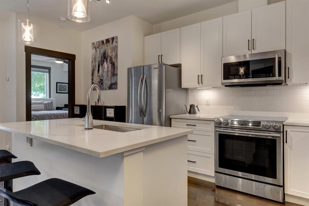 Discover the epitome of urban living in this expansive 2 bed, 2 bath apartment, featuring a stunning renovated kitchen with white shaker cabinets, stone countertops, and modern stainless steel appliances. The open concept layout seamlessly connects the living, kitchen, and dining areas, all bathed in natural light—perfect for entertaining guests or relaxing in front of the cozy living area by the fireplace. Both bedrooms are generously sized, with the primary bedroom boasting a spacious walk-through closet leading to a fantastic updated 4-piece en-suite bathroom. The second bedroom is conveniently located near the additional 4-piece bathroom. A dedicated office space makes working from home a breeze, and in-unit laundry adds to the convenience of this incredible condo. Step outside through the sliding doors to enjoy your private patio, complete with gas hookup. The unit includes an underground parking spot in the heated parkade and an additional storage unit, a true necessity for condo living. Located near the vibrant heart of Marda Loop, you'll be steps away from trendy boutiques, incredible coffee shops, and fantastic bars and restaurants. You're also close to the entertainment district of 17th Ave. This apartment offers a perfect blend of modern luxury and urban convenience. Don't miss out on this exceptional opportunity.