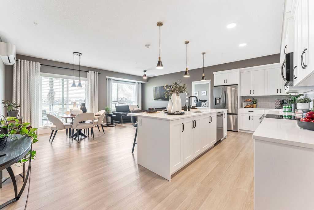 Welcome to this stunning, newly built condominium in the heart of Cranston's Riverstone community! This beautiful home, boasting 1,188 square feet of luxurious living space, is a perfect blend of modern comfort and stylish design. With 2 bedrooms, a versatile den, and 2 bathrooms, it offers ample space for both relaxation and productivity -- live and work (from home) where you play in Cranston's Riverstone. Built in 2023, this condo is filled with top-notch upgrades that TRULY SET IT APART. The exceptionally large kitchen features sleek quartz countertops and stylish, upgraded Samsung appliances, making it a chef's delight. The large island comfortably seats four, and this is in addition to the large dining area, making it perfect for family gatherings or entertaining friends. Custom closets in the primary walk-in and the laundry room provide smart storage solutions, while upgraded window coverings, bathroom fixtures, and lighting fixtures add a touch of sophistication throughout the home. These designer upgrades total close to $25,000 alone, making it the perfect home for those who want the lock-and-leave lifestyle but do not want to compromise on space and style. Stay comfortable year-round with the installed heat pump, offering efficient air conditioning in the summer and extra warmth in the cooler months. Unlike other units, this condo comes with not one, but two storage lockers, providing extra space for all your belongings. The convenience continues with heated underground parking, ensuring your vehicle is secure and warm during the winter months, and secure bike storage just down the hall for exploring on two wheels all that Cranston's Riverstone has to offer. Situated on the elevated ground floor, this unit offers beautiful views of the surrounding area, including a picturesque pond. Enjoy the serene environment and the easy access to the river, where you can float or fish to your heart's delight, making it perfect for those who love nature and outdoor activities. Cranston's Riverstone community is known for its vibrant amenities, and you'll be within walking distance to all it has to offer. This one-of-a-kind community has parks, walking paths, shopping and dining, as well as Century Hall, Cranston's Resident's Association, which offers a skating rink, tobogganing hill, splash park, tennis and basketball courts, and a playground. The community's location also means easy access to major roadways, providing immeasurable convenience for commuting to downtown, getting to South Health Campus or exploring the surrounding communities. Don't miss the chance to call this exceptional condominium your home. Schedule a viewing today and experience the perfect combination of luxury and convenience in Cranston's Riverstone!